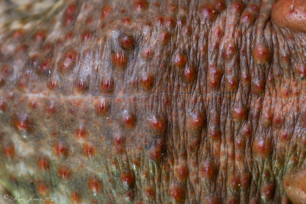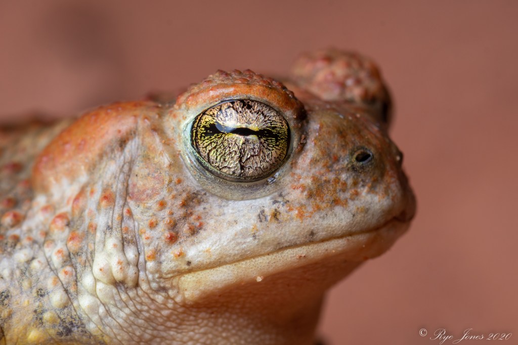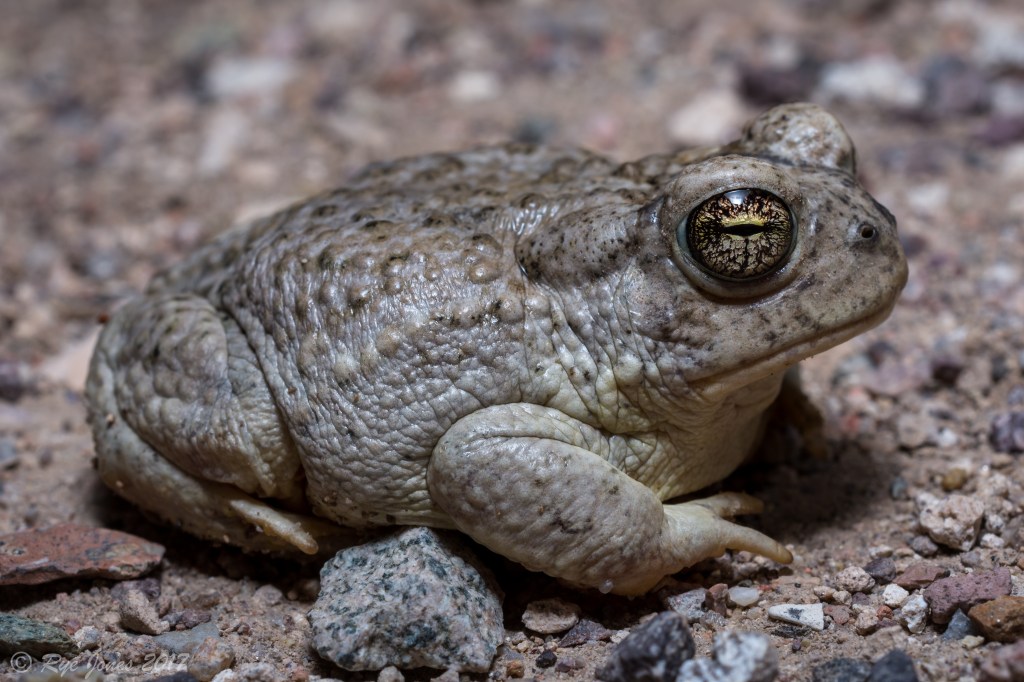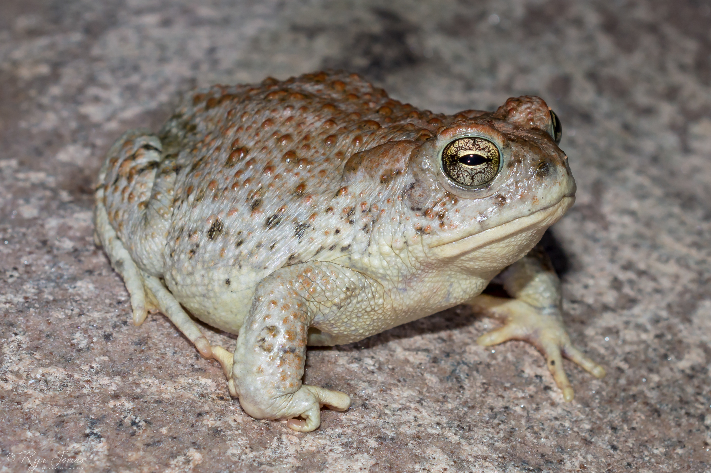 Description: Tan, gray, olive, or orange base color. A poorly defined or absent vertebral stripe. A light stripe between the eyes. The cranial crests are poorly defined. The parotoid glands are large and oval-shaped.