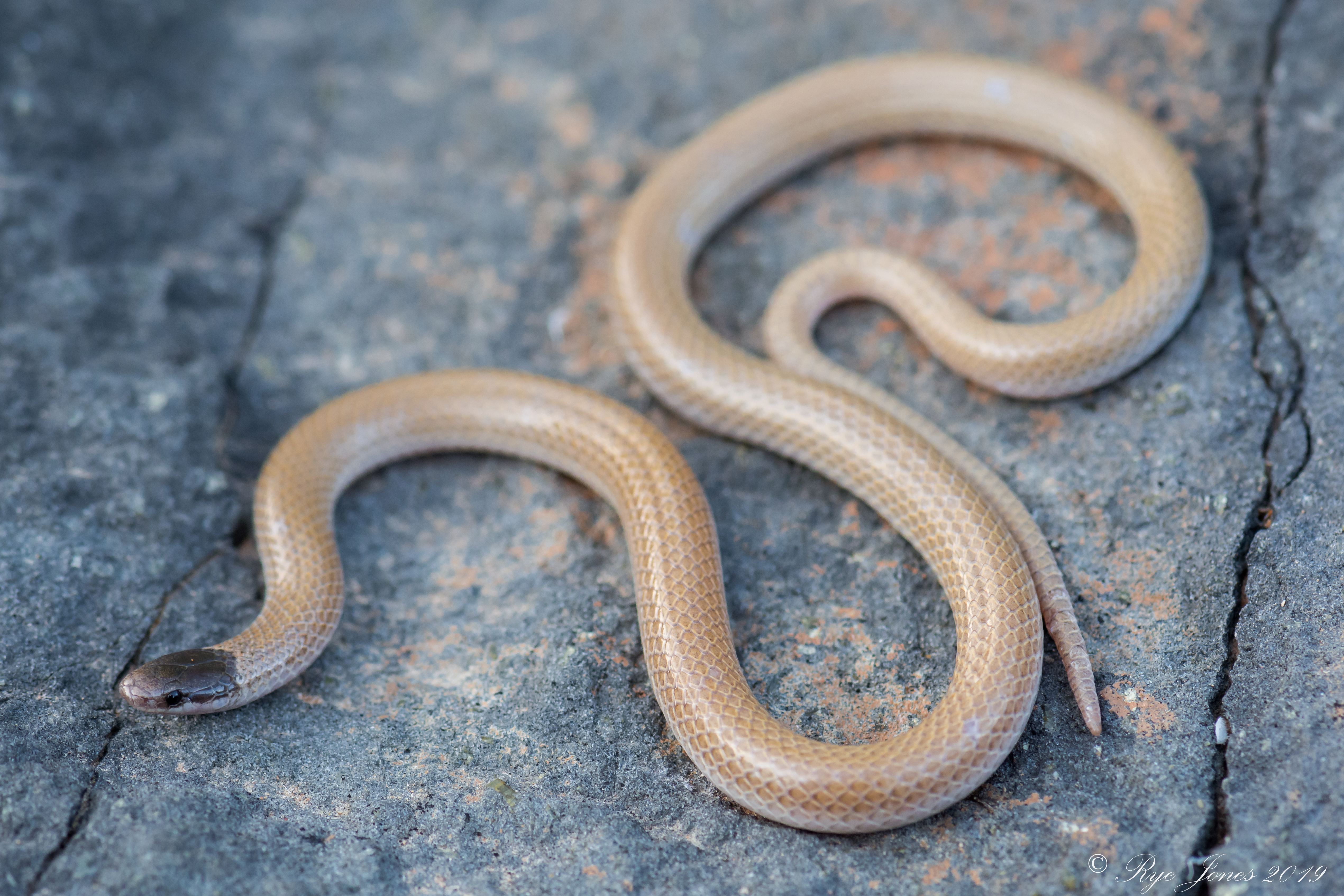 Description: A patternless tan or brown body with a black cap on top of the head. The ventral has a salmon-pink, orange or red stripe. This snake has smooth scales.