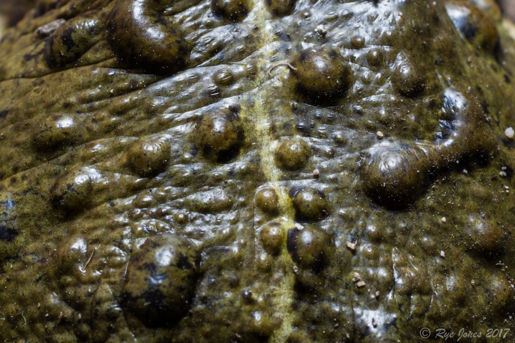 Description: Brown, gray, or olive base color. The pattern can range from many well-defined dark blotches and/or spots to very few. A well-defined light vertebral stripe is usually present. Females generally have more pattern, more “warts”, and a more prominent vertebral stripe. The underside is usually cream-colored with dark spots. The parotoid glands are oval-shaped and there are no cranial crests.
