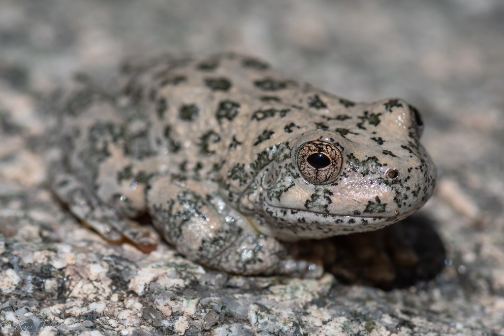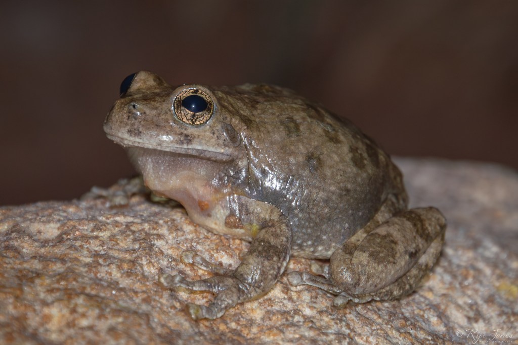 Description: Gray, tan, or brown base color often matching the color of the surrounding rock type. Darker brown, gray, or sometimes green blotching or spots on the dorsal. The legs have a barred pattern. Coloration can vary depending on the environment and even on the time of day. The inner thighs and groin area are yellow or orange in color. Large toepads and webbed hind feet.