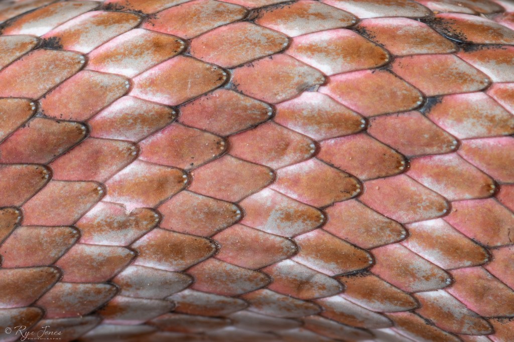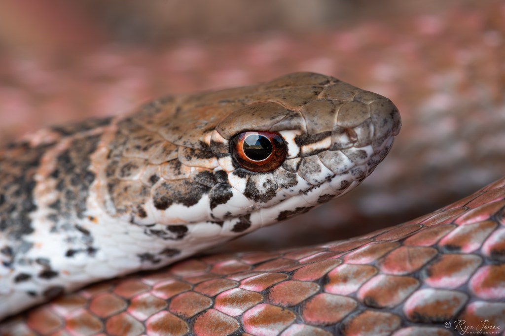 Description: This snake comes in a variety of colors including pink, tan, reddish-brown, yellow, and orange. Patterning can also vary from banded to mottled to nearly patternless. Juveniles have strongly patterned bands or bars toward the neck that fade further down the body. Juveniles also have a more speckled pattern on their face. Coachwhips get their name from the braided patterning on their tails that resemble a whip. They have smooth scales and large eyes. They are known to be extremely fast.