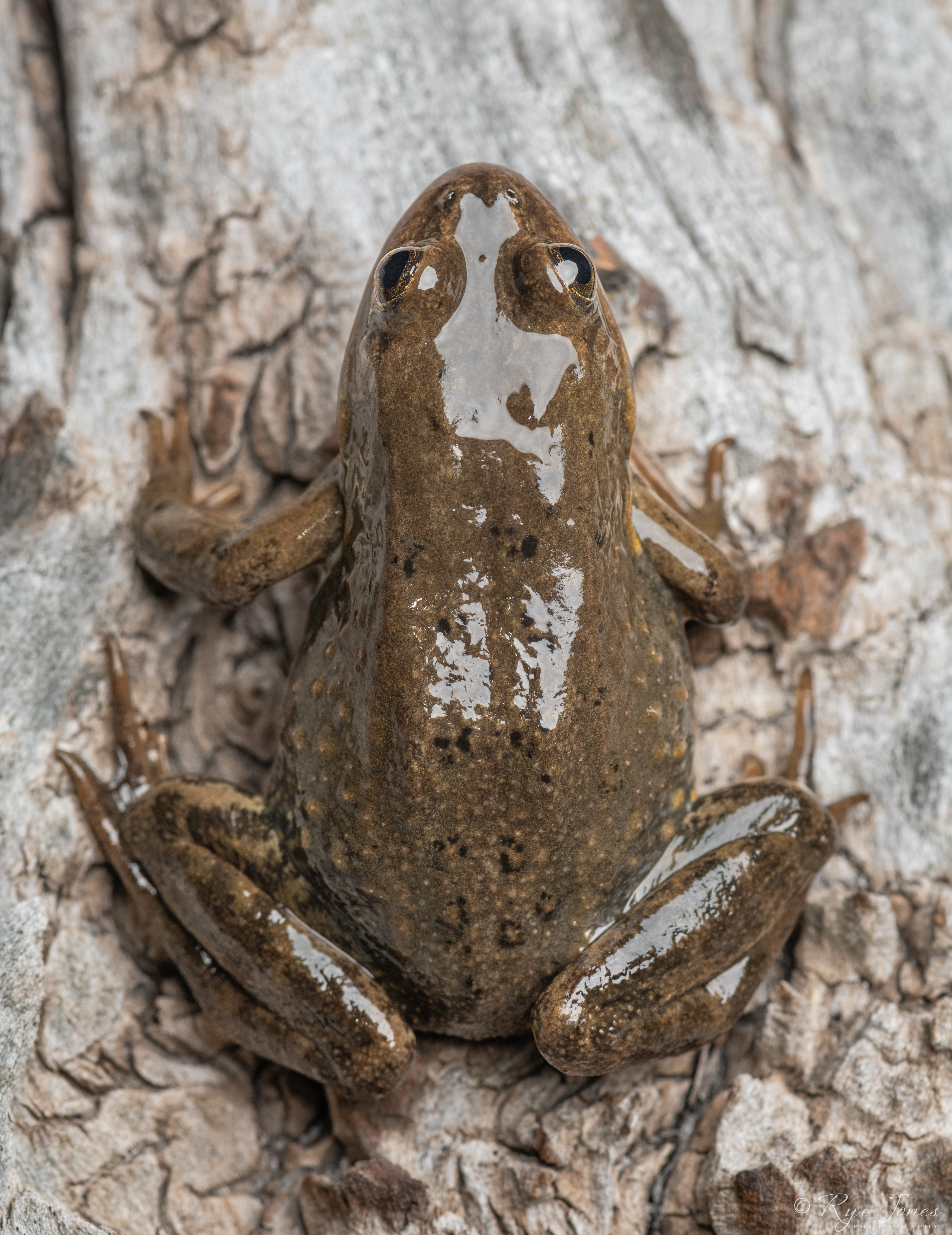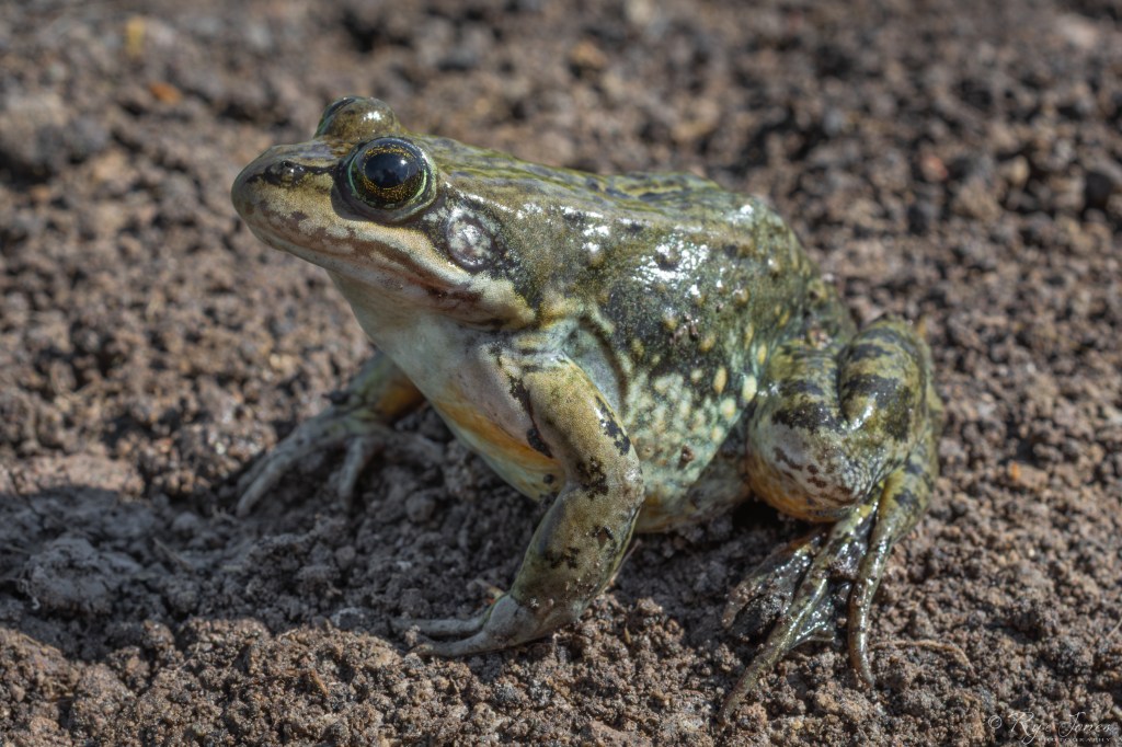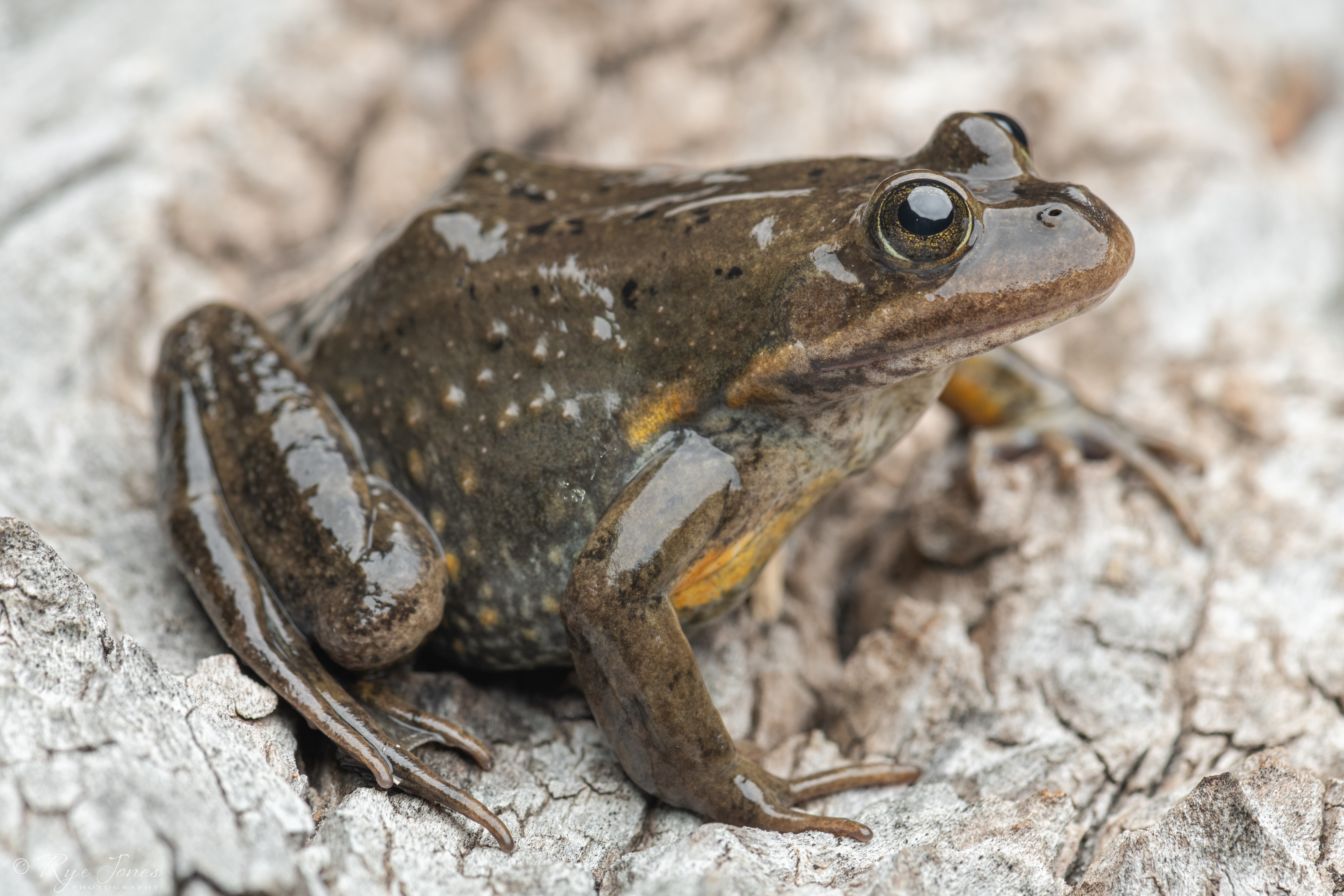 Description: Tan, brown, or olive green base color with irregular black spots on the dorsal. The eyes are upturned. The rear legs are relatively short with heavily webbed feet. A light-colored stripe is typically present along the upper lip. The underside is cream-colored but can be a bright yellow or orange in adults, especially on the underside of the legs.