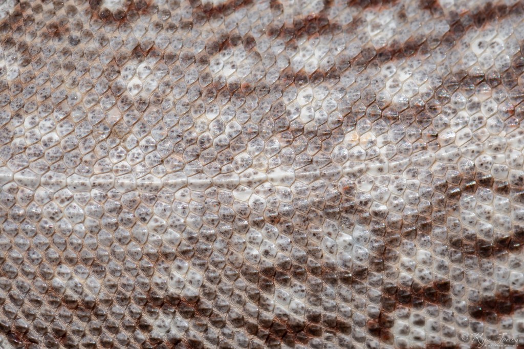 Description: Gray, tan, or cream base color with white or cream spots along the dorsal. The spots are encircled by a reddish-brown reticulated pattern. It has reddish-brown spots on the lower sides. Spots and patterning merge to form bands on the tail. The scales are small with an enlarged row of keeled scales forming a crest that runs down the back. The head is blunt, but small compared to the body size. Adults develop reddish-brown patches on their lower sides during breeding season. Juveniles are similar in pattern to adults but can appear more banded or spotted.