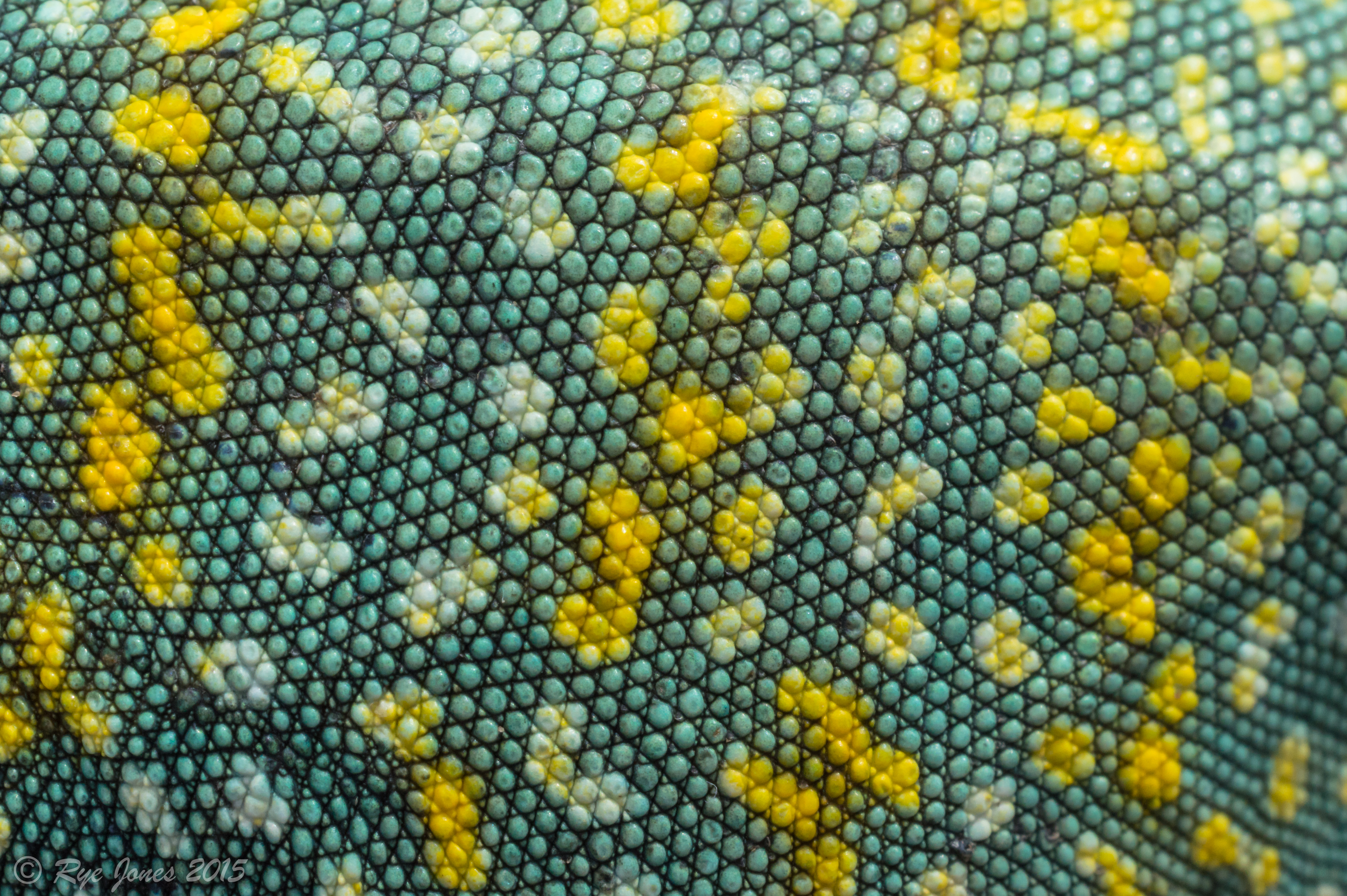 Description: Blue-green, turquoise, or olive-green base color on the dorsal with light-colored spots. The patterning reverses on the tail with dorsal base-colored spots on a light-colored base. The dorsal has faded yellow banding. The head is large with varying degrees of yellow coloration. The jaws are large with brown, dorsal-colored, or dark spots on the face. The scales are small and granular. Two black collars border a light-colored or yellow collar on the neck. The forelimbs generally lack spots. The inside of the mouth can be black in some individuals. Males have a blue-green or turquoise patch on the throat. Females develop distinct orange patterning when gravid and can overall have less blue-green or turquoise coloration. Juveniles are more distinctly banded than adults.