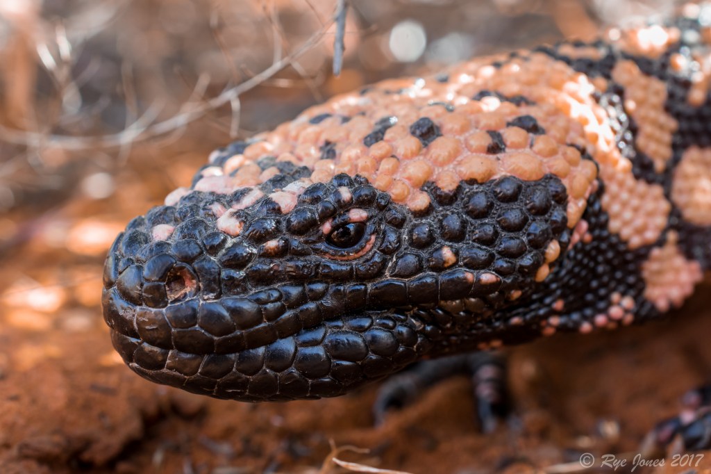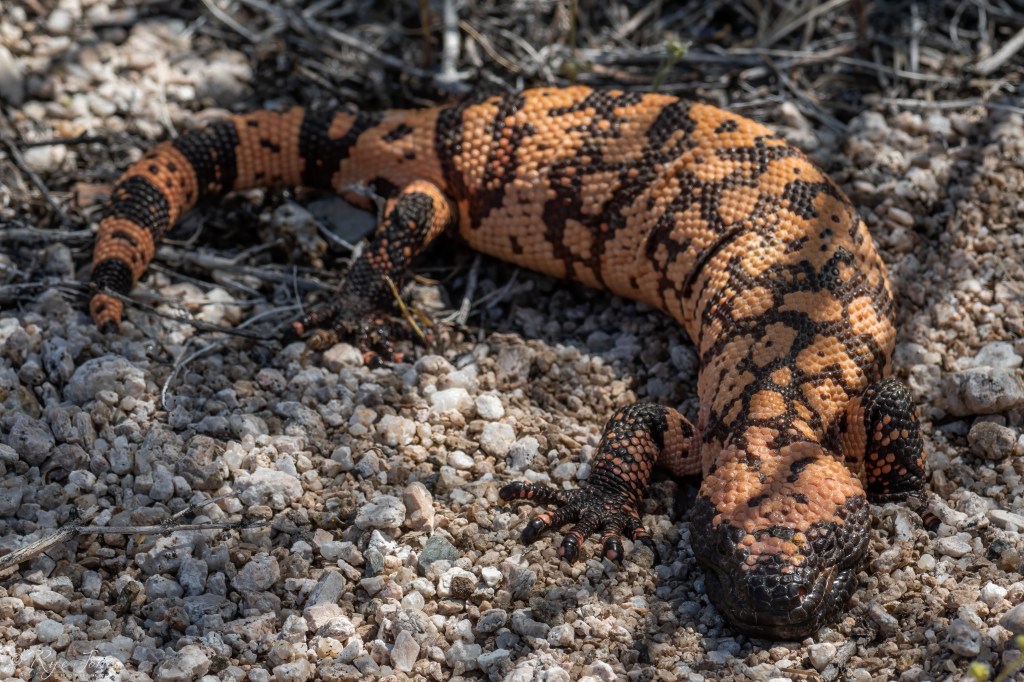 Description: Orange or yellow-orange base color with black bands and reticulated patterns along the body. The tail is short and blunt with black bands. The head is large, and the face and nose are black. The scales are large and bead-like. This species is the only venomous lizard in the United States.