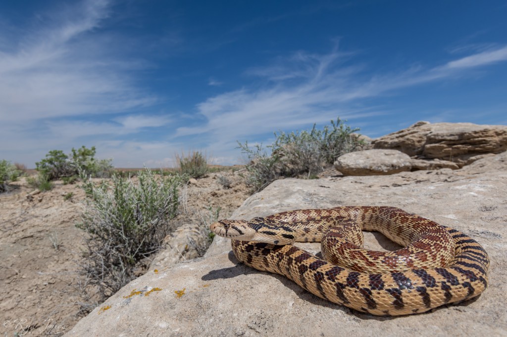 Description: A light brown, tan, or yellow base color with brown, dark brown, reddish-brown, or black blotching down the dorsal. The blotching can be one color or often times the blotching is dark brown or black toward the head and tail, and brown mid-body. The pattern usually becomes more distinct toward the tail and can appear as dark bars or bands. A dark bar is usually present behind the eyes to the back of the mouth. It has keeled dorsal scales. This is one of Utah’s most commonly encountered snakes.
