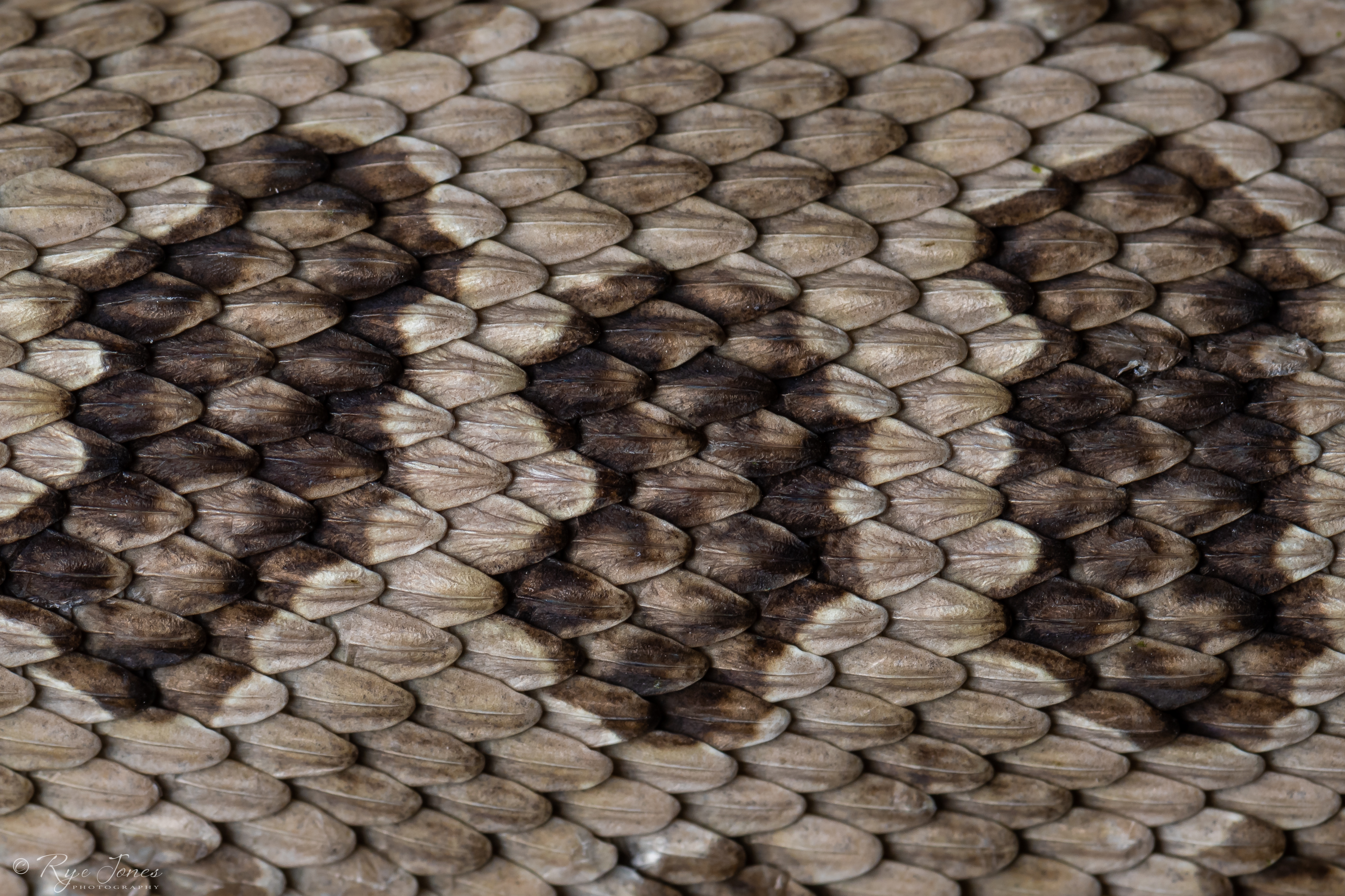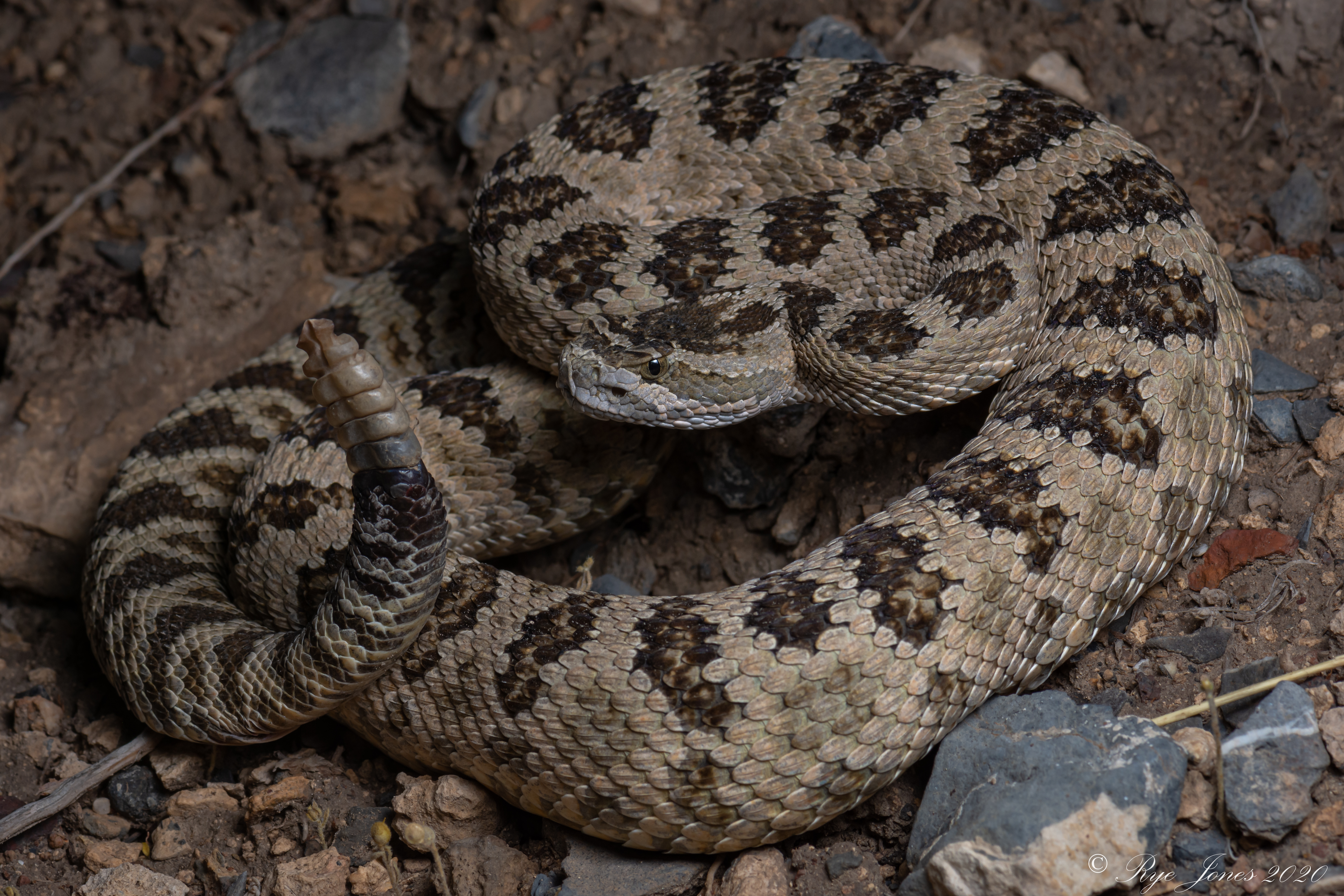 Description: The base color is brown, tan, yellow, gold, or gray with brown, tan, or black blotches on the dorsal. The blotches can be solid colored or light in the center with a dark border. Lighter-colored blotching occurs down the sides. The head usually has a dark blotch on top. A light-colored bar passes from the rear of the jaw through and between the eyes. Juveniles have a white base color with a bold pattern. The scales are keeled. This is Utah’s most commonly encountered rattlesnake.