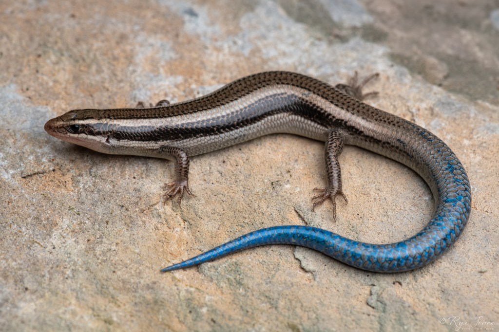 Description: The base color is shades of dark brown, tan, reddish-brown, or golden brown. Two dorsolateral light tan or cream stripes run the length of the body to the base of the tail. A second pair of light-colored stripes run along the lower sides of the body from the back of the mouth to the base of the tail. The sides between the light stripes are often darker than the dorsal. The tail can be twice the length of the body, but is often broken and/or regenerated. The tail in adults can be unicolored or speckled in faded blue coloration. The body is elongated with small limbs. The scales are smooth and shiny with rounded rear edges. Adult males develop orange coloration around their mouth and throat during the breeding season. Juveniles have a darker overall coloration and a bright blue tail.