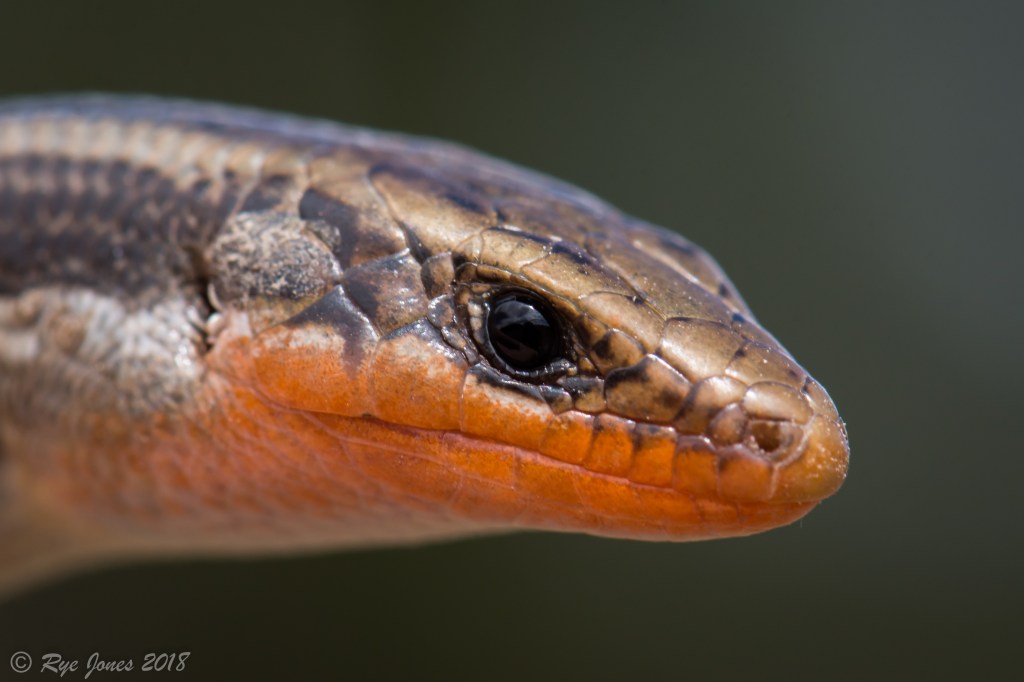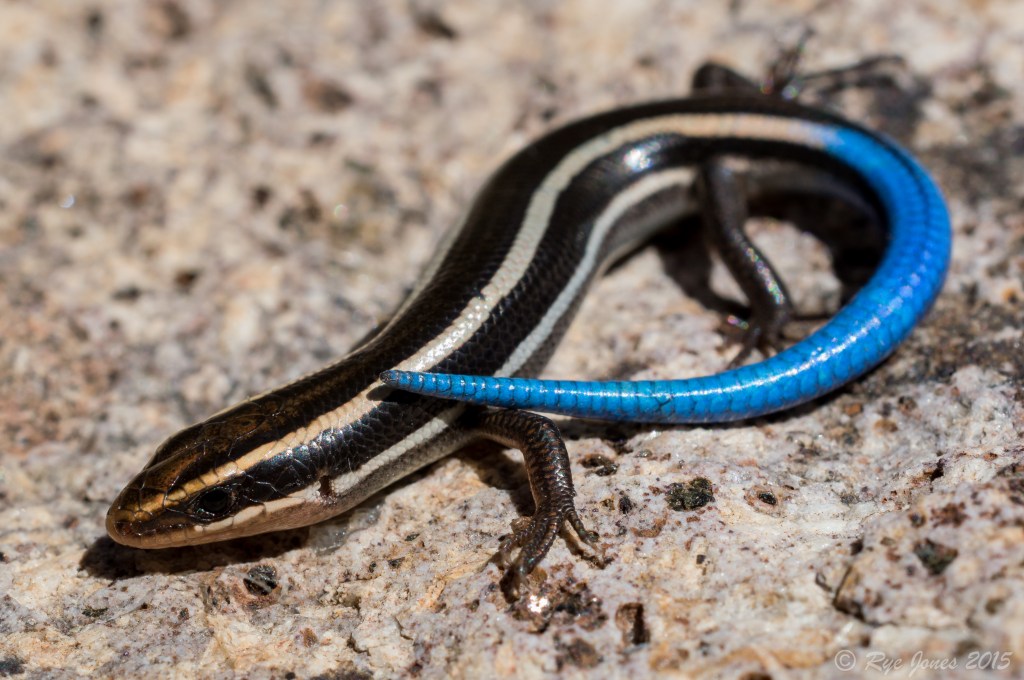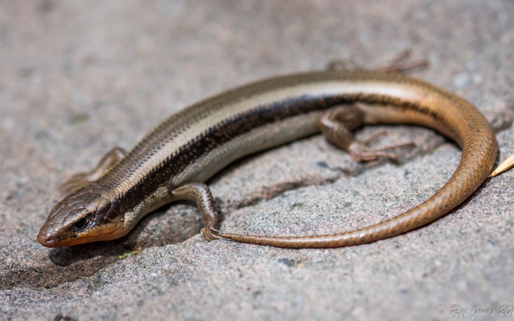 Description: The base color is shades of dark brown, tan, reddish-brown, or golden brown. Two dorsolateral light tan or cream stripes run the length of the body to the base of the tail. A second pair of light-colored stripes run along the lower sides of the body from the back of the mouth to the base of the tail. The sides between the light stripes are often darker than the dorsal. The tail can be twice the length of the body, but is often broken and/or regenerated. The tail in adults can be unicolored or speckled in faded blue coloration. The body is elongated with small limbs. The scales are smooth and shiny with rounded rear edges. Adult males develop orange coloration around their mouth and throat during the breeding season. Juveniles have a darker overall coloration and a bright blue tail.