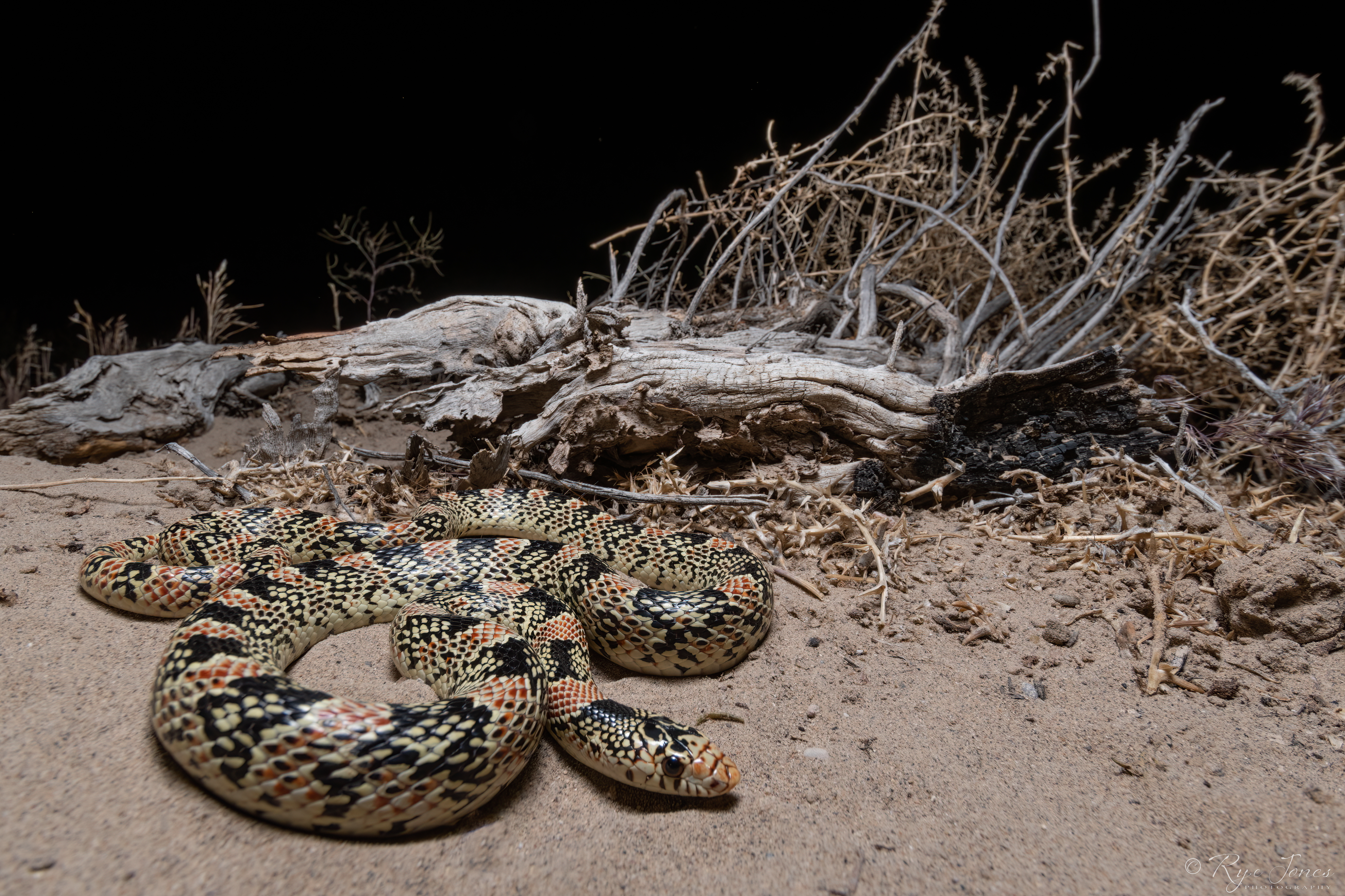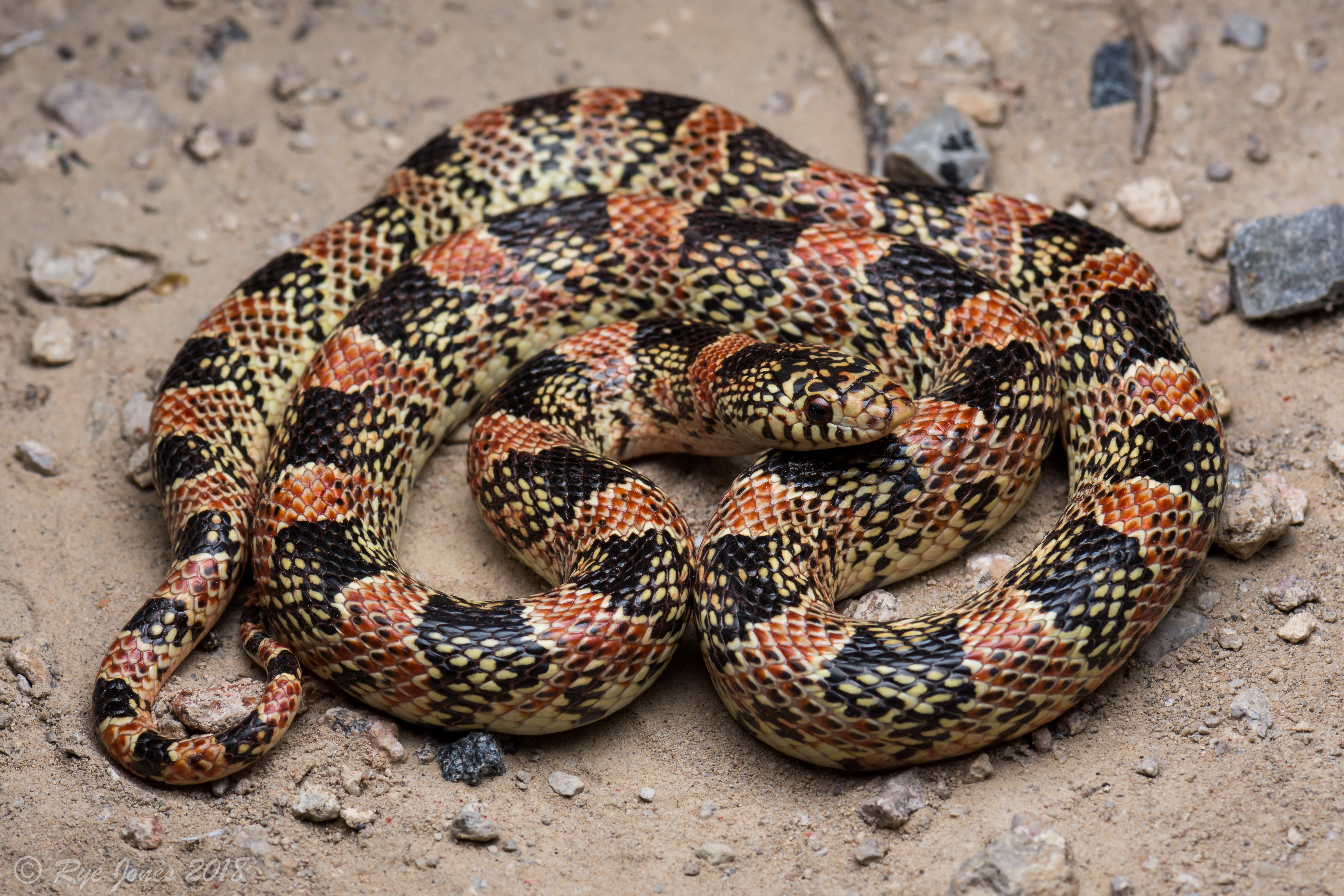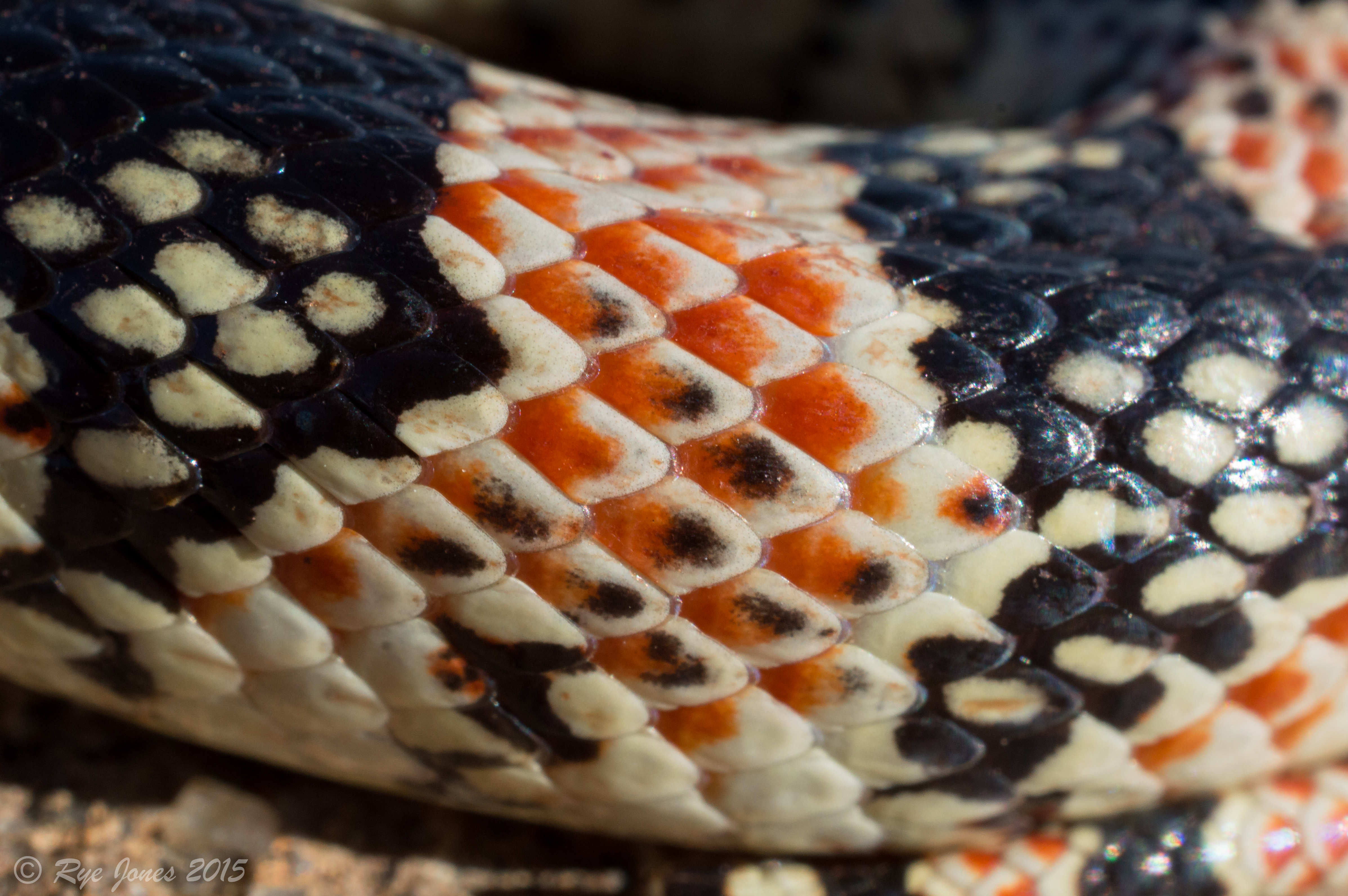 Description: The base color is white or cream with black saddles along the dorsal. There are varying degrees of red interspersed between the black saddles. The red scales have white or cream-colored tips. The sides of the black saddles have white or cream-colored speckling and the sides of the red sometimes have black speckling. Occasionally red coloration is significantly reduced or absent, especially in juvenile individuals. The ventral is usually patternless and the saddles do not wrap around. The eyes are red or orange in color. The snout is pointed with a countersunk jaw. This snake has smooth scales. It is fossorial and primarily nocturnal.