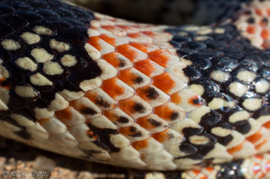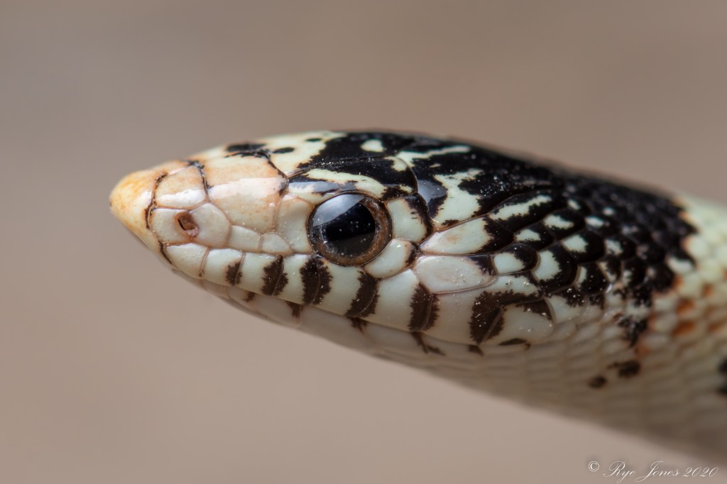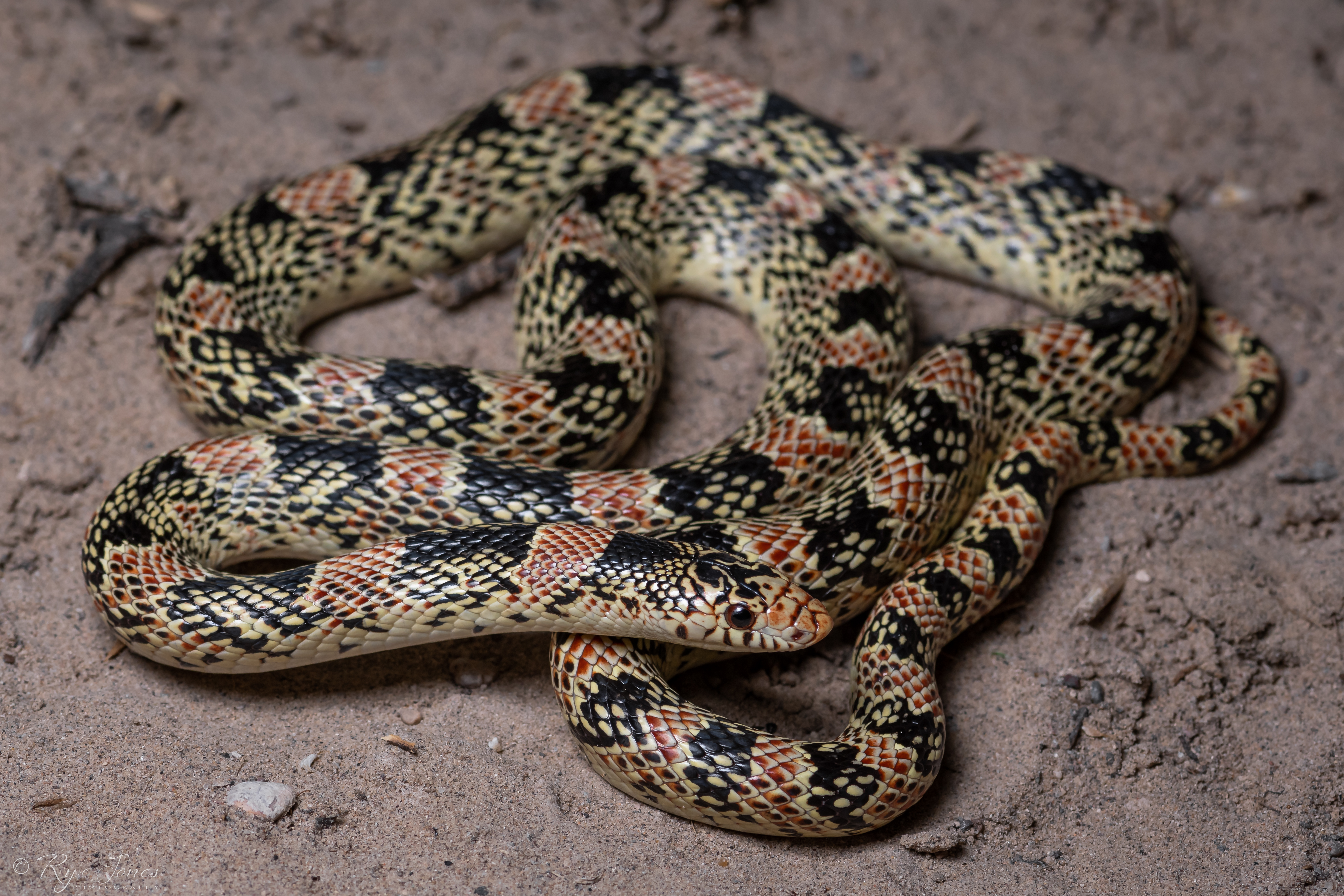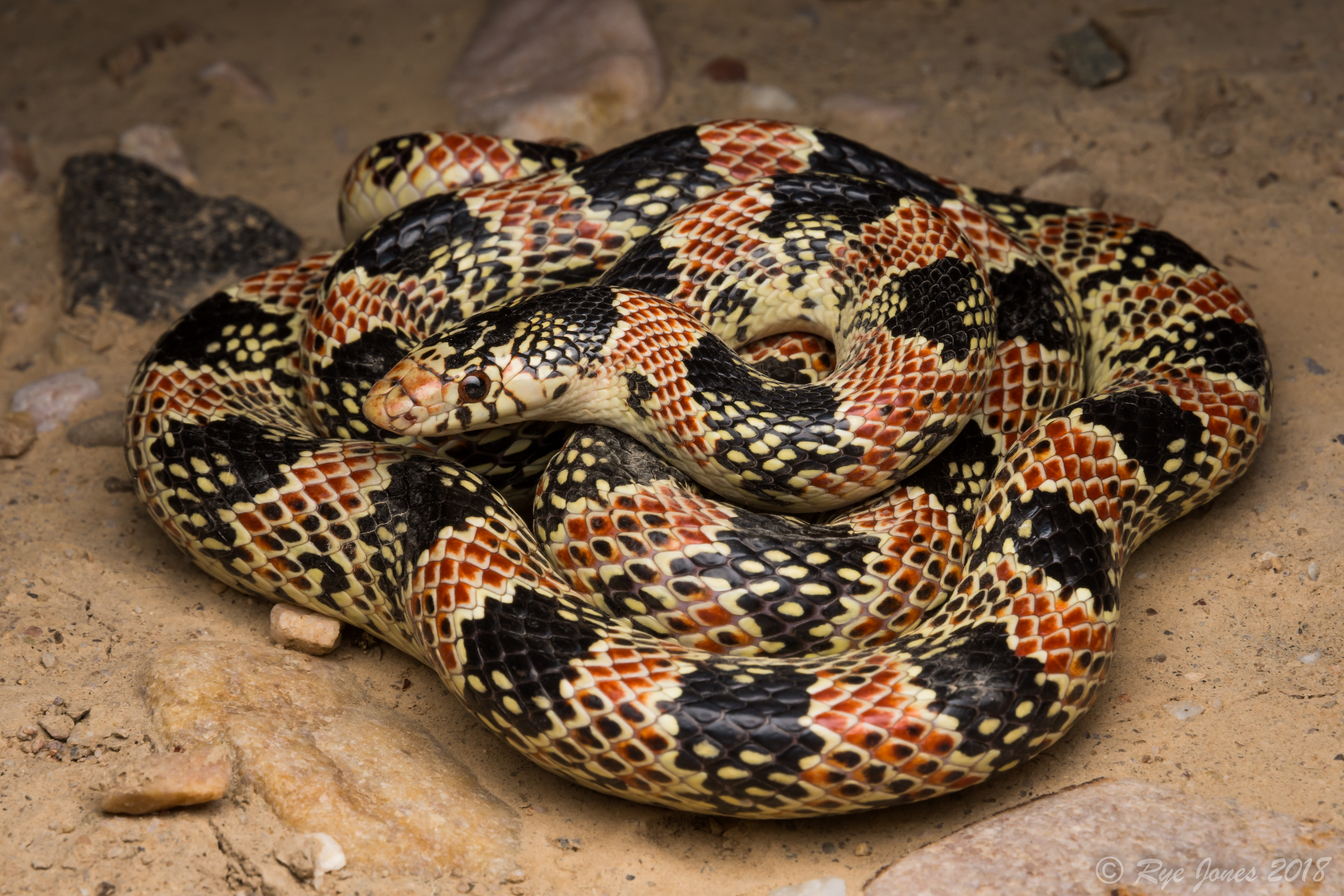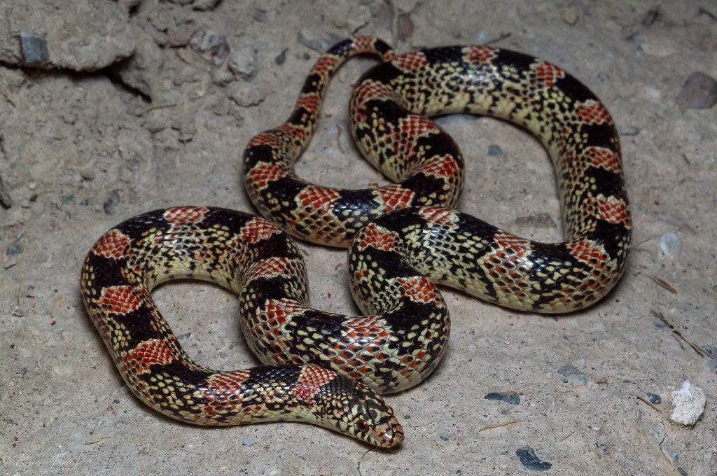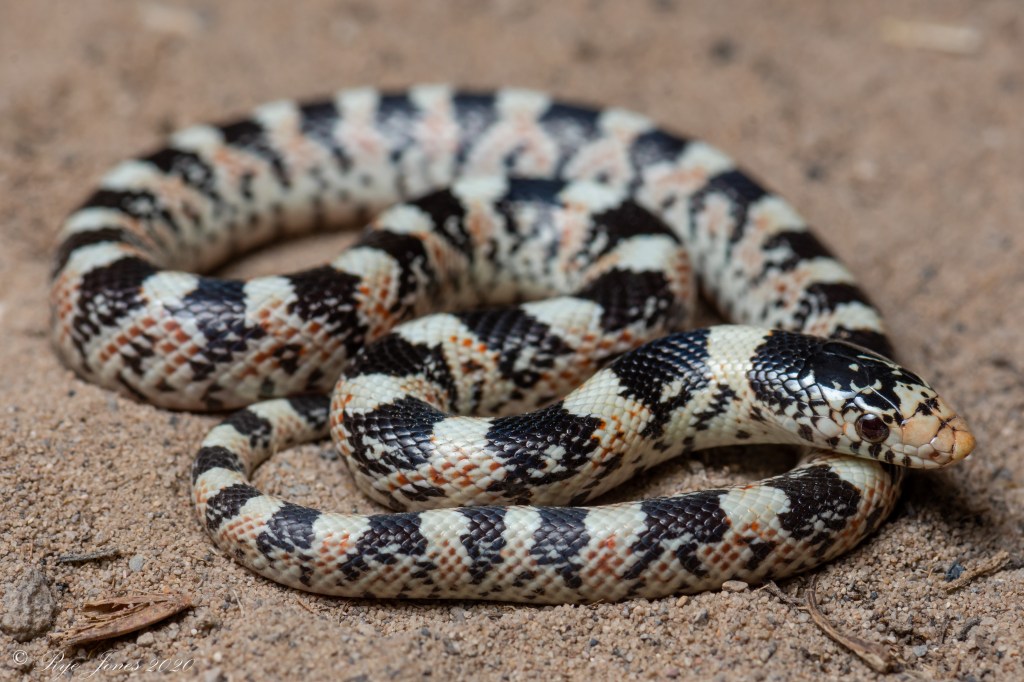 Description: The base color is white or cream with black saddles along the dorsal. There are varying degrees of red interspersed between the black saddles. The red scales have white or cream-colored tips. The sides of the black saddles have white or cream-colored speckling, and the sides of the red saddles sometimes have black speckling. Occasionally, red coloration is significantly reduced or absent, especially in juvenile individuals. The ventral is usually patternless, and the saddles do not wrap around. The eyes are red or orange in color. The snout is pointed with a countersunk jaw. This snake has smooth scales. It is fossorial and primarily nocturnal.