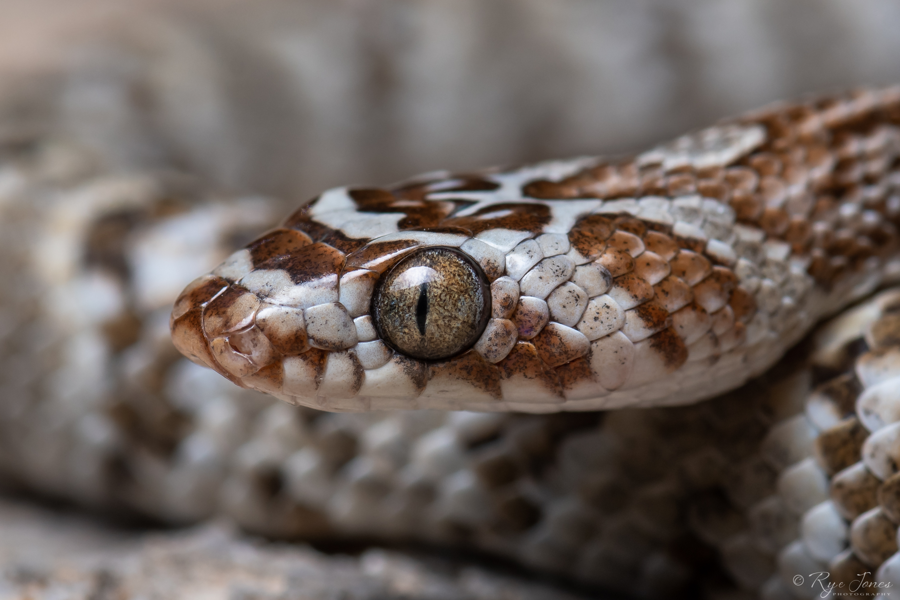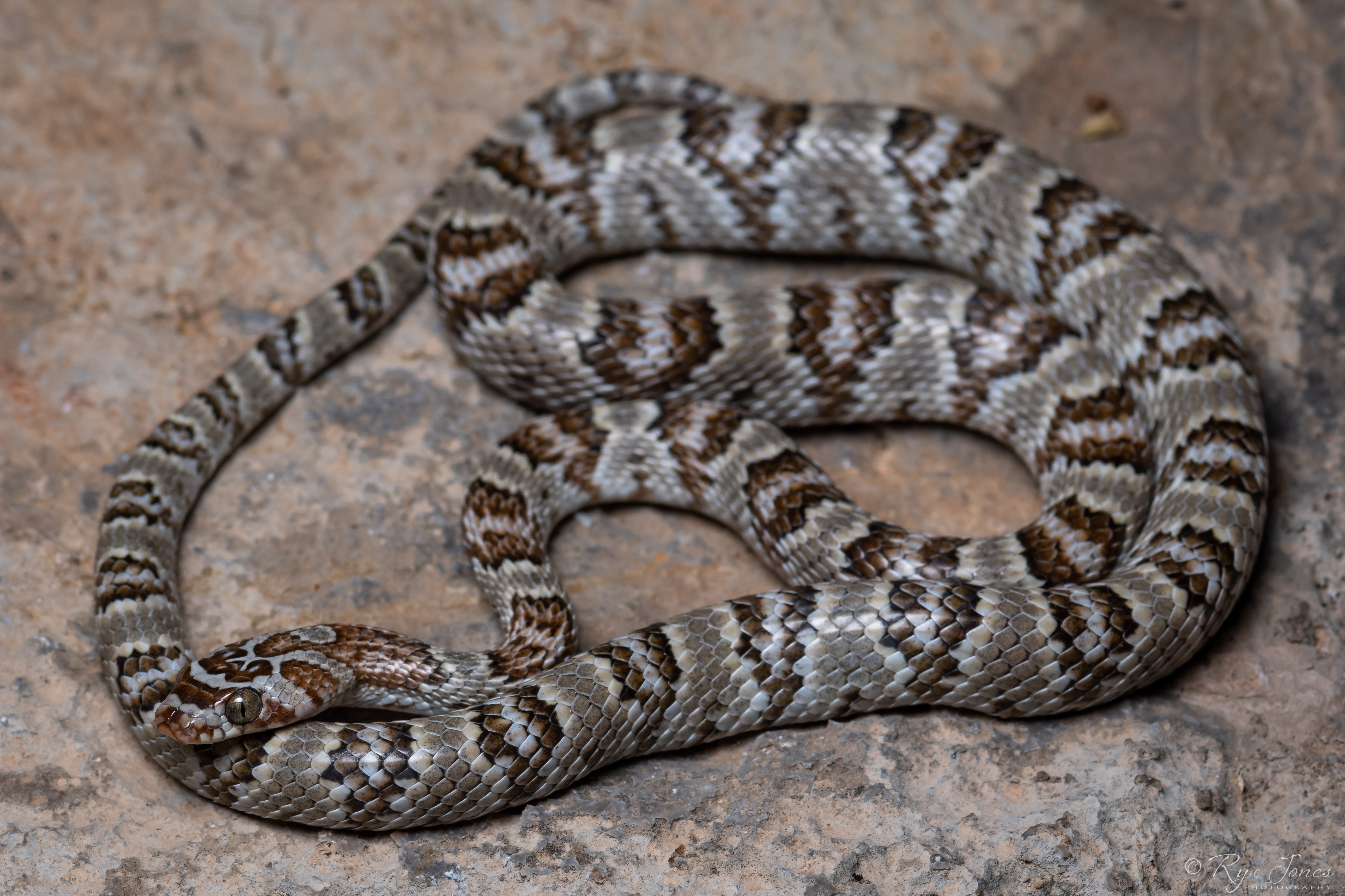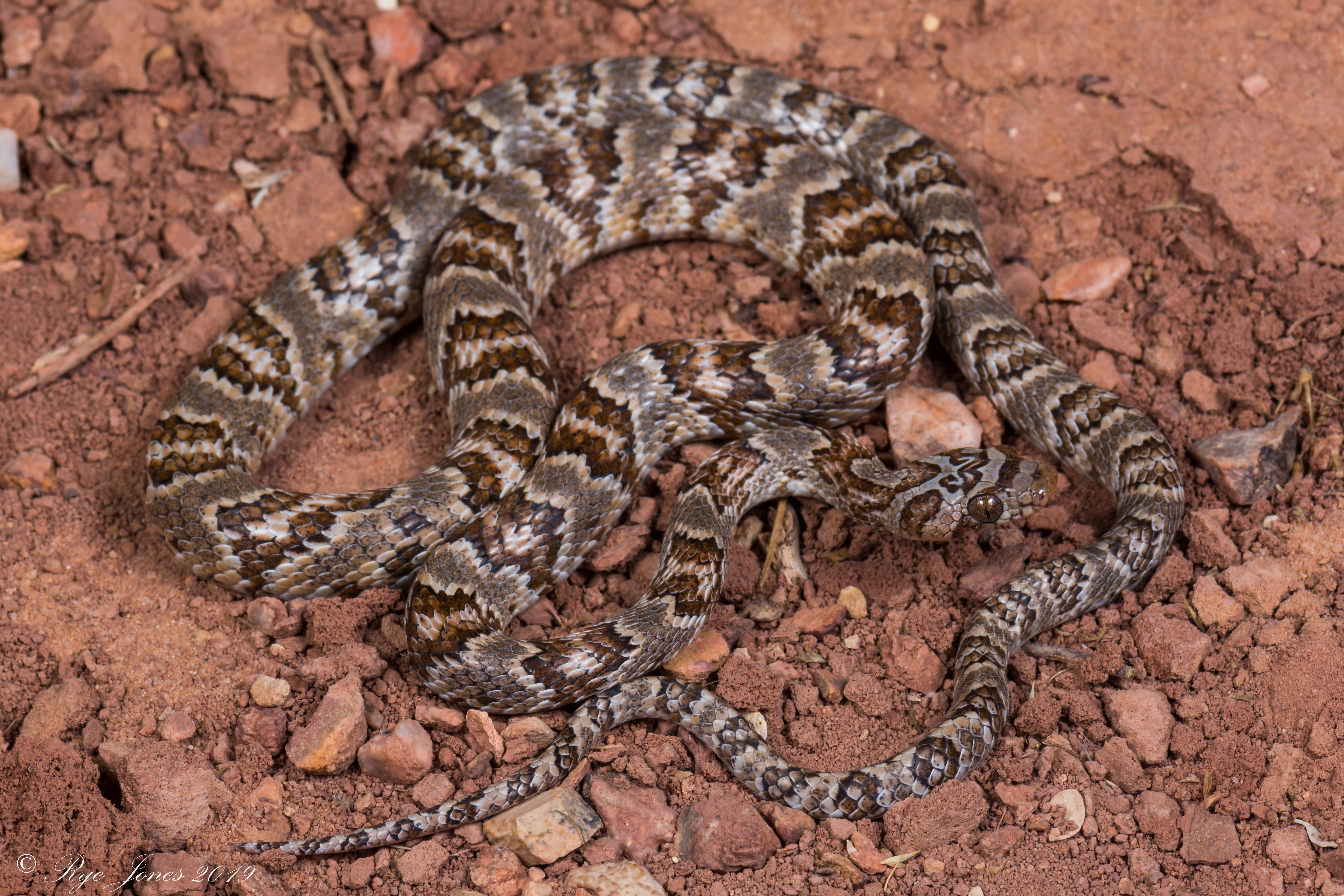 Description: Gray to grayish-brown base color. Irregular brown or reddish-brown blotching with light centers down the dorsal. Slender neck with a large head. It has a lyre-shaped marking on top of the head with a dark bar between the eyes. This snake has large eyes with vertical pupils. It has smooth scales and is primarily nocturnal.