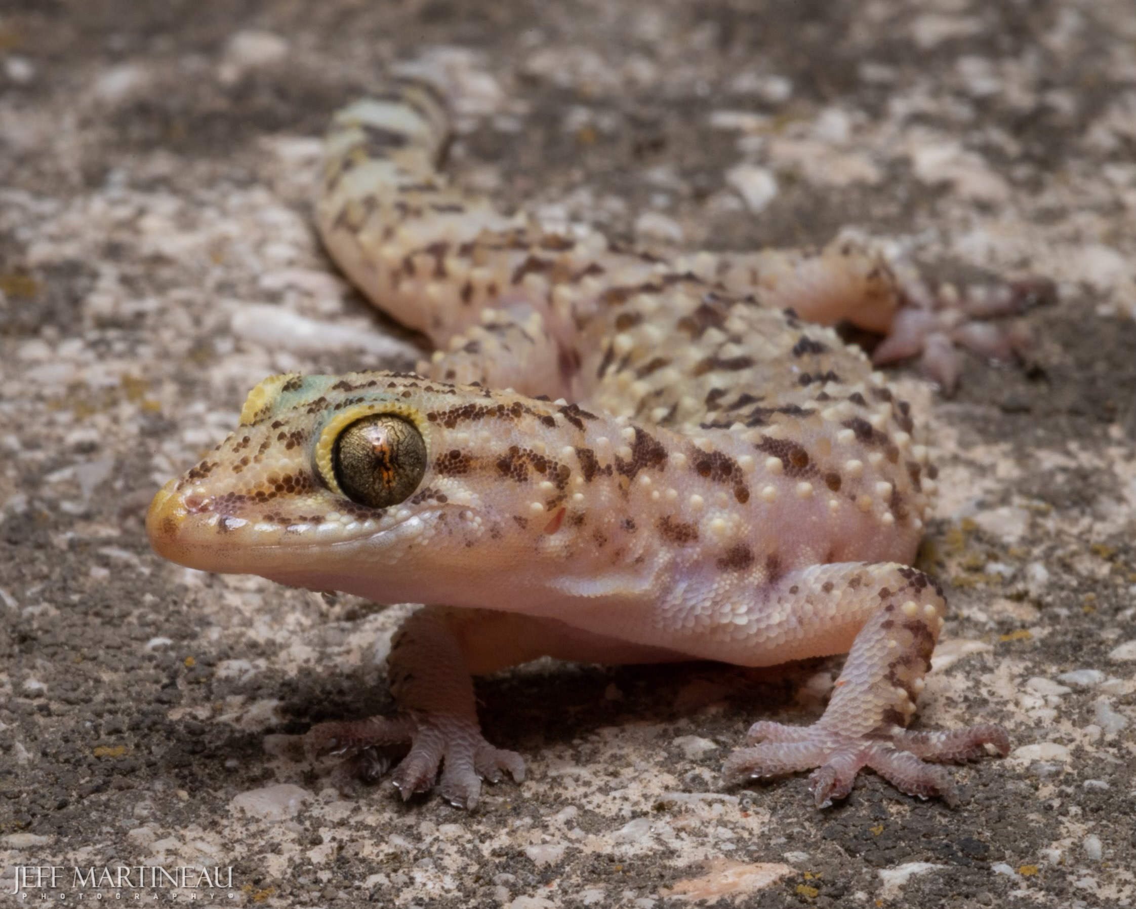 Description: Tan, brown, cream, gray, or pinkish base color with irregular brown spots on the dorsal. Large bumpy tubercles along the body, most prominent on the upper sides. Large eyes with vertical pupils that are lacking eyelids. Small toe pads. This gecko is nocturnal and coloration can change from day to night with darker coloration being common during the day.