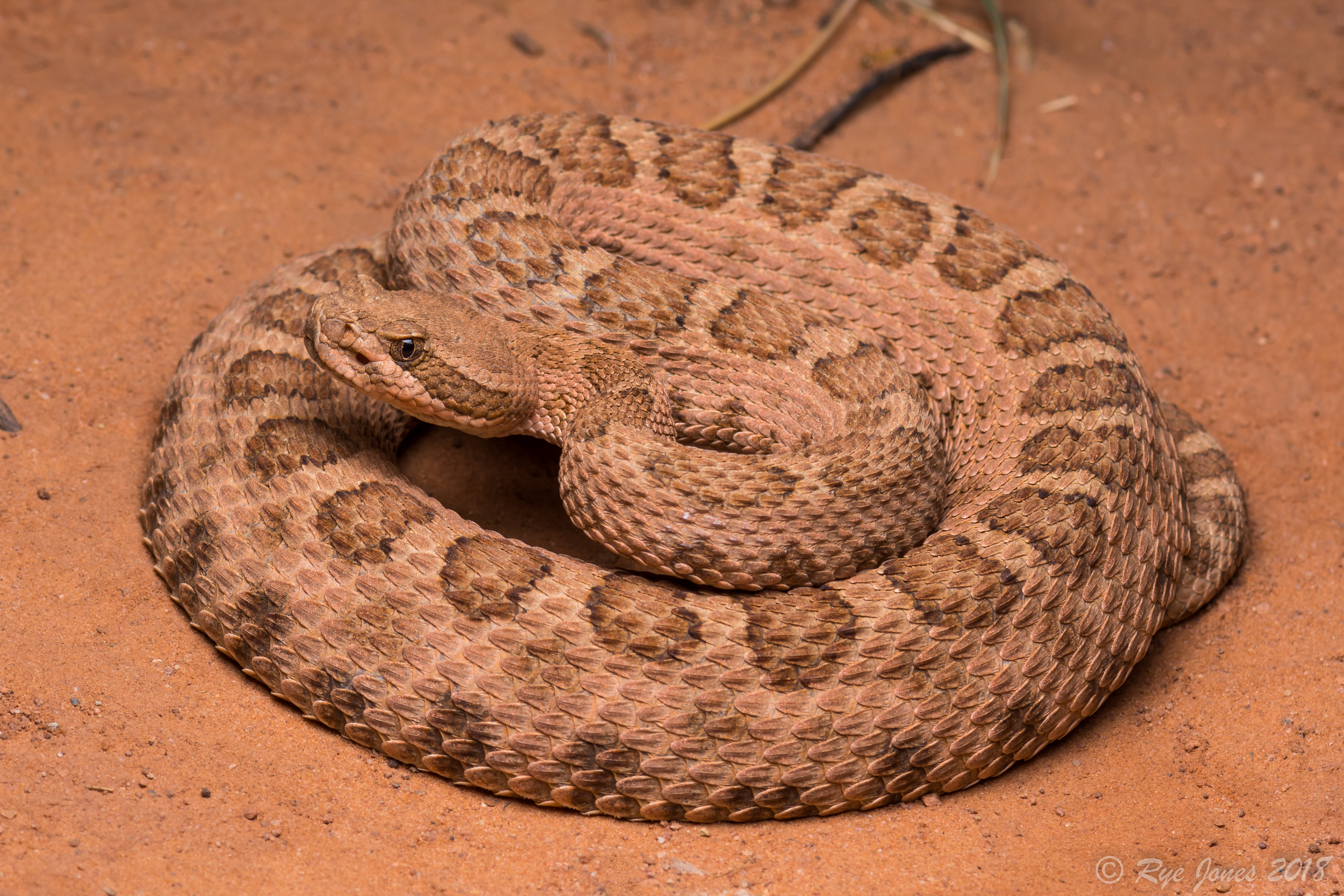 Description: The base color is gray, tan, reddish-brown, orange, or pinkish in color. The dorsal blotching is slightly darker than the base color and can be reduced, very faded, or absent. A dark bar, when present, extends from behind the eye to the back of the jaw. The tail tip at the base of the rattle is dark brown or black. Juveniles have a bolder pattern that fades with age. The scales are keeled.