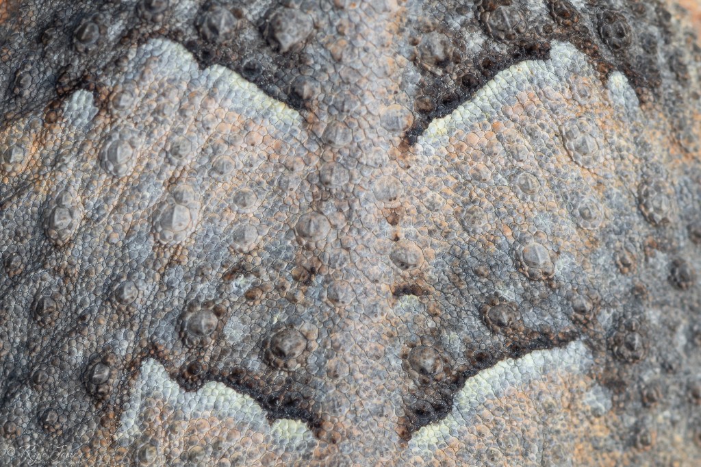 Description: Tan, brown, cream, or gray base color; often closely matching the surrounding substrate. Orange coloration is often present on the lower sides. A pair of dark blotches on the back of the neck. A row of paired irregular wavy blotches runs along the dorsal. The blotches are often edged in white or cream. The tail is shorter than the body length and can appear banded. The body is flat, wide, and rounded. Spine-like scales cover the body, with a single fringe of these scales running along the lower sides. The horns on the back of the head are well-developed. The two central horns are the longest and do not contact each other at the base. The snout is blunt.