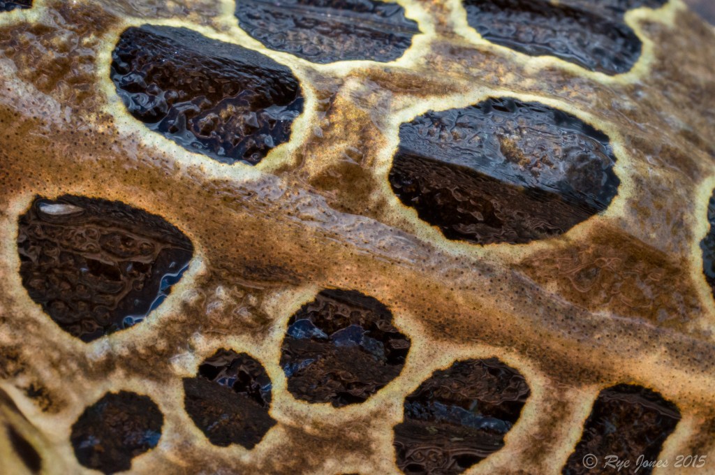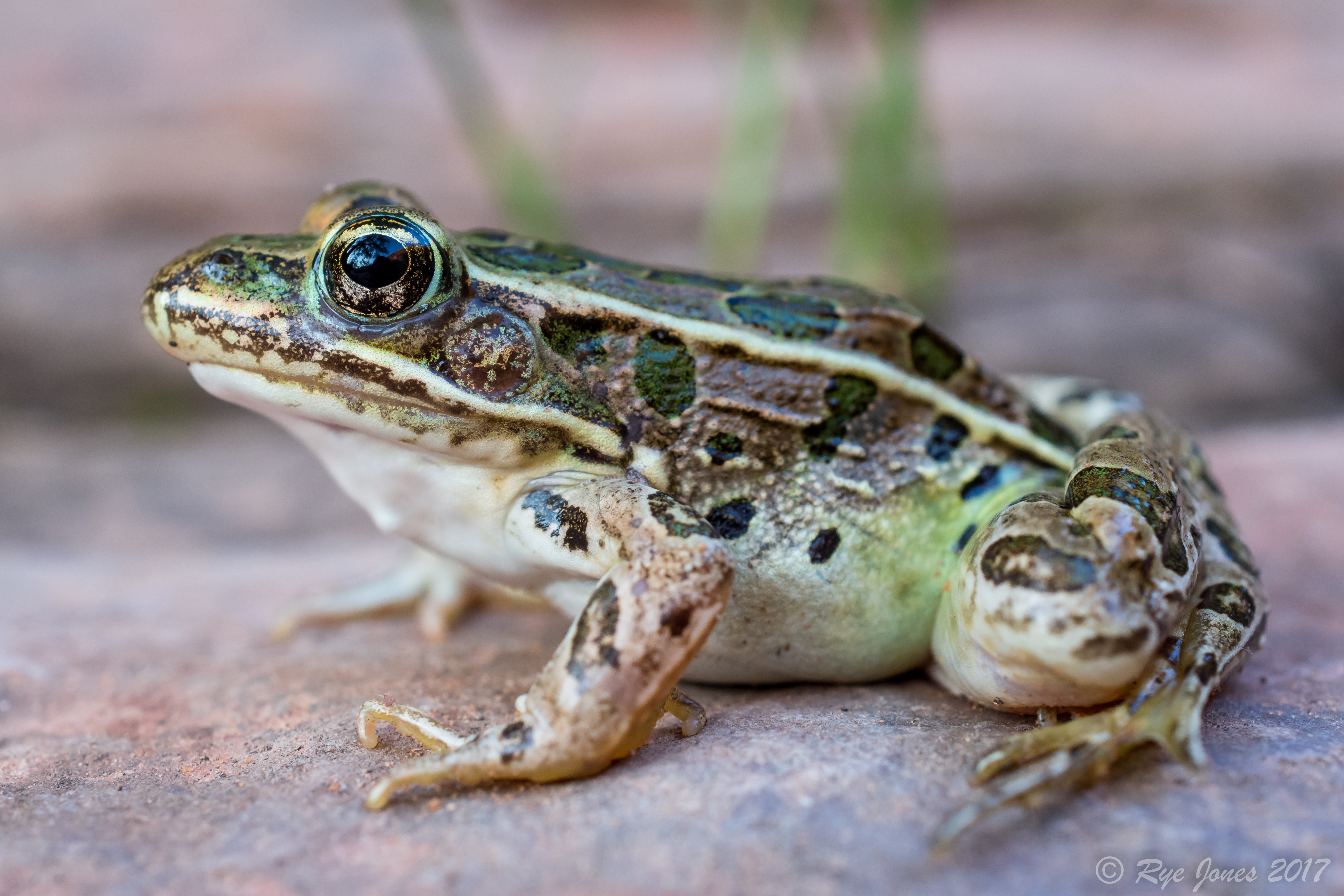 Description: Brown, tan, green, or bronze base color. Large dark brown, green, or black spots with light borders on the dorsal and sides. The rear legs have a barred pattern and the rear of the thighs have dark spots. The dorsolateral ridges are unbroken. A dark spot on the snout and a well-defined light stripe runs along the upper lip. The underside is cream or off-white colored.