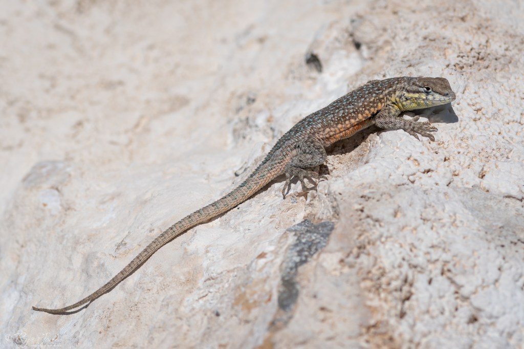 Description: Brown, tan, gray, or orange-brown base color with a dark blotch on each side behind the forelimbs. This blotch can sometimes be faint or absent, especially in females. The scales are weakly keeled. Females have two dorsolateral stripes on each side of the body that are light in color and extend from the snout to the base of the tail. A pair of blotches runs along the middorsal between the stripes. The blotches can range in color from light blue to black. Males typically lack the striped pattern and have scattered blue and light-colored speckling along their body and tail. Males have a blue, yellow, or orange patch on their throats that is more vibrant during the breeding season. This is one of Utah’s most commonly encountered lizards.
