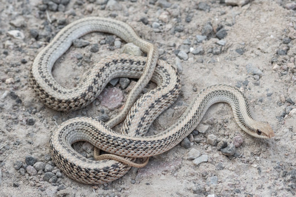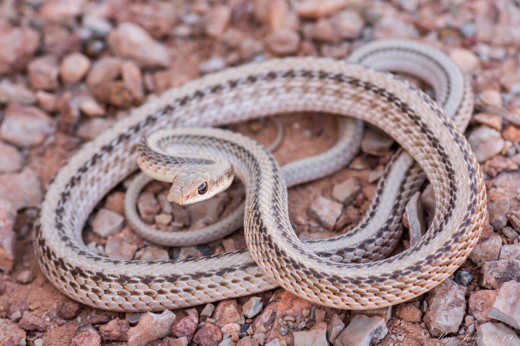 Description: Tan, cream, or gray base color. A solid stripe closely matching the base color runs down the dorsal. This stripe is bordered by dark brown or black stripes and a narrower dark brown or black stripe runs down the side of the body. This snake has an enlarged rostral (nose) scale. It has large eyes and smooth scales.