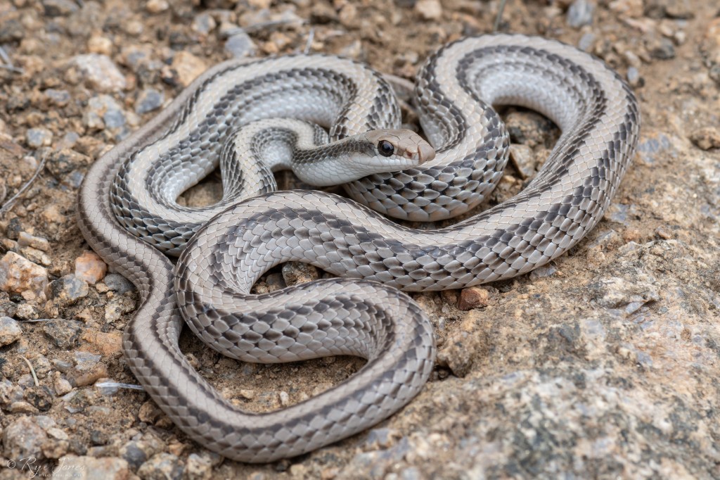 Similar Species: The Spotted Leaf-nosed Snake has blotches, not stripes. The Desert Striped Whipsnake lacks an enlarged rostral scale.