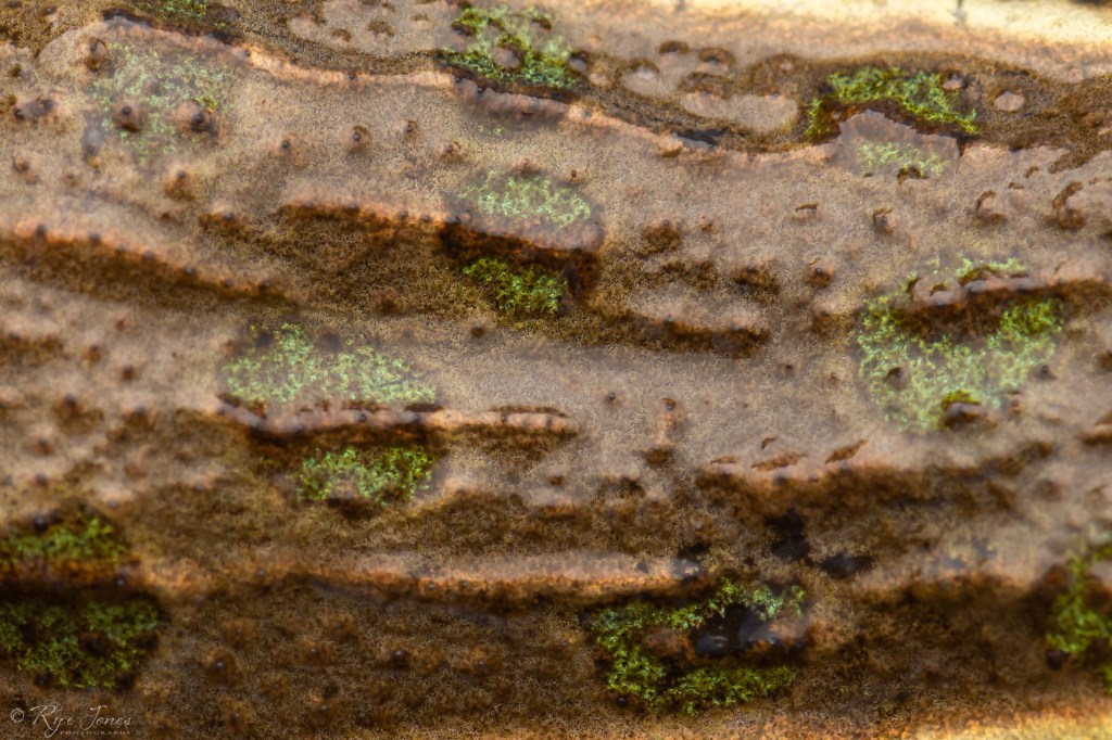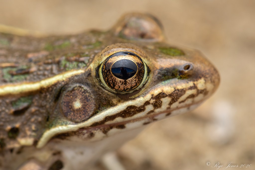 Description: Tan, brown, or green base color. Large dark brown, green, or black spots on the dorsal and sides. The spots get smaller as they get lower on the sides. The rear legs have a barred pattern with a dark reticulated pattern on the rear of the thighs. This species typically has a spot on the snout and a light-colored spot in the center of the tympanum (ear). The dorsolateral ridges are broken and inset posteriorly. A well-defined light stripe runs along the upper lip. The underside is cream or off-white colored.