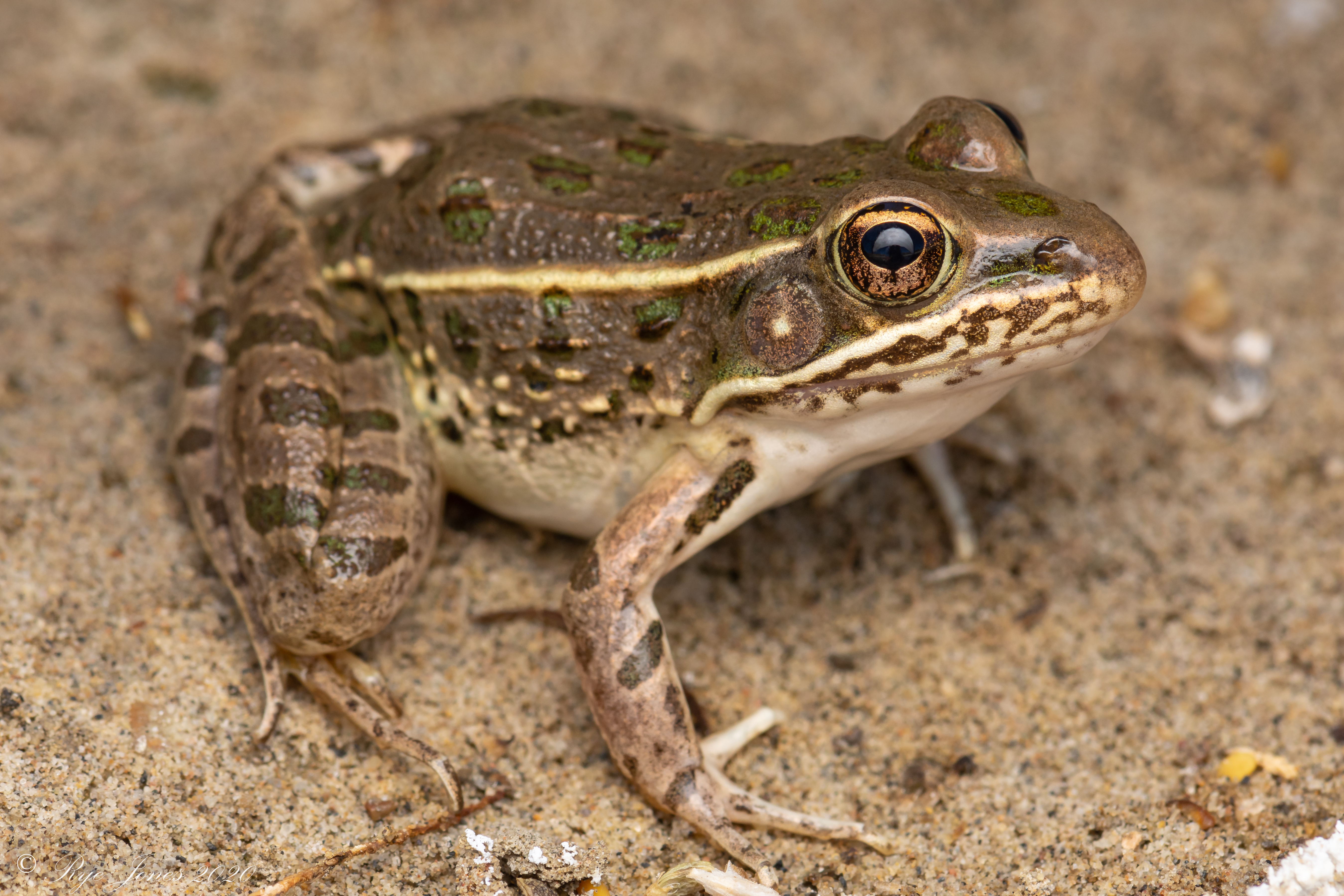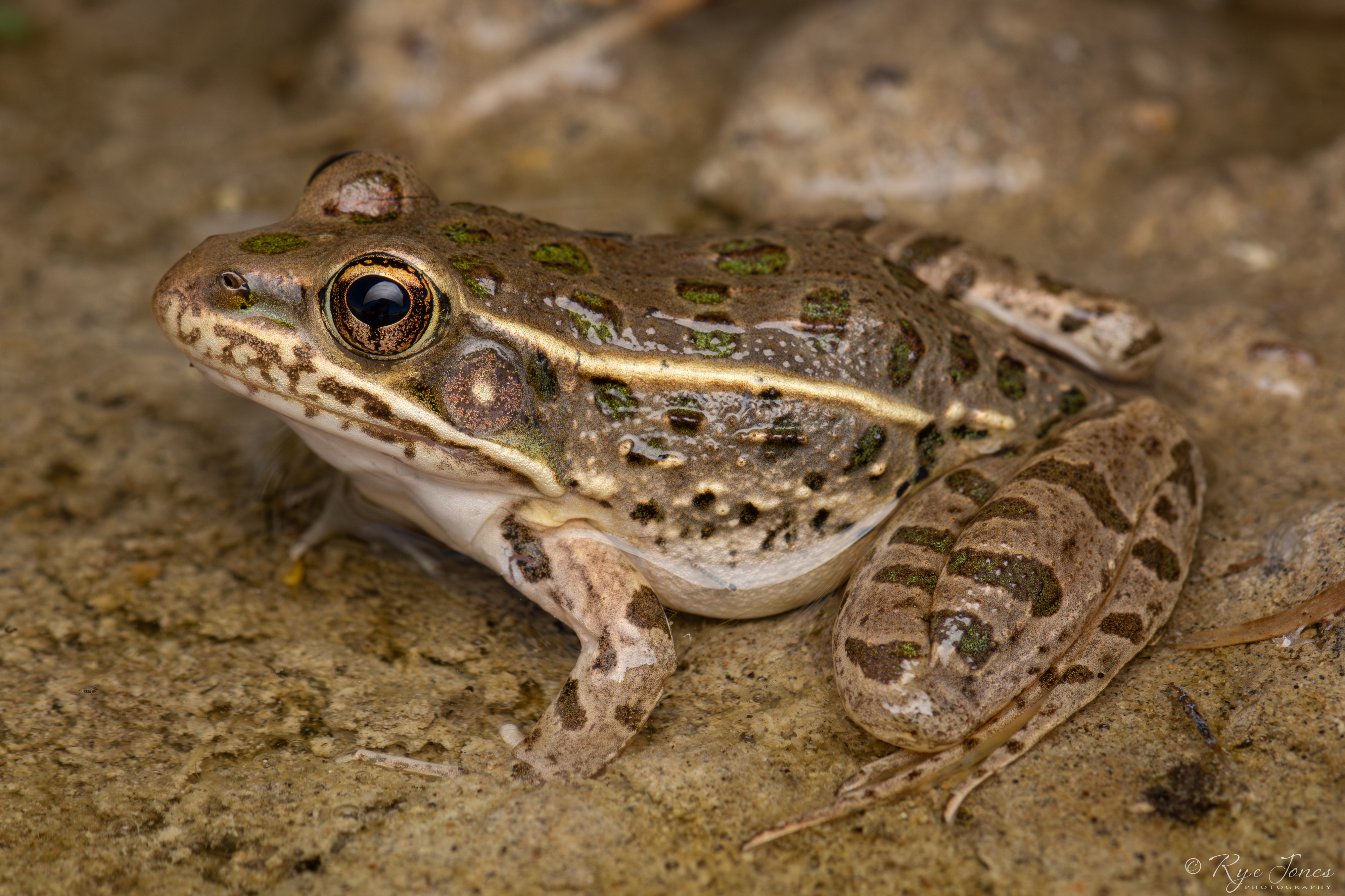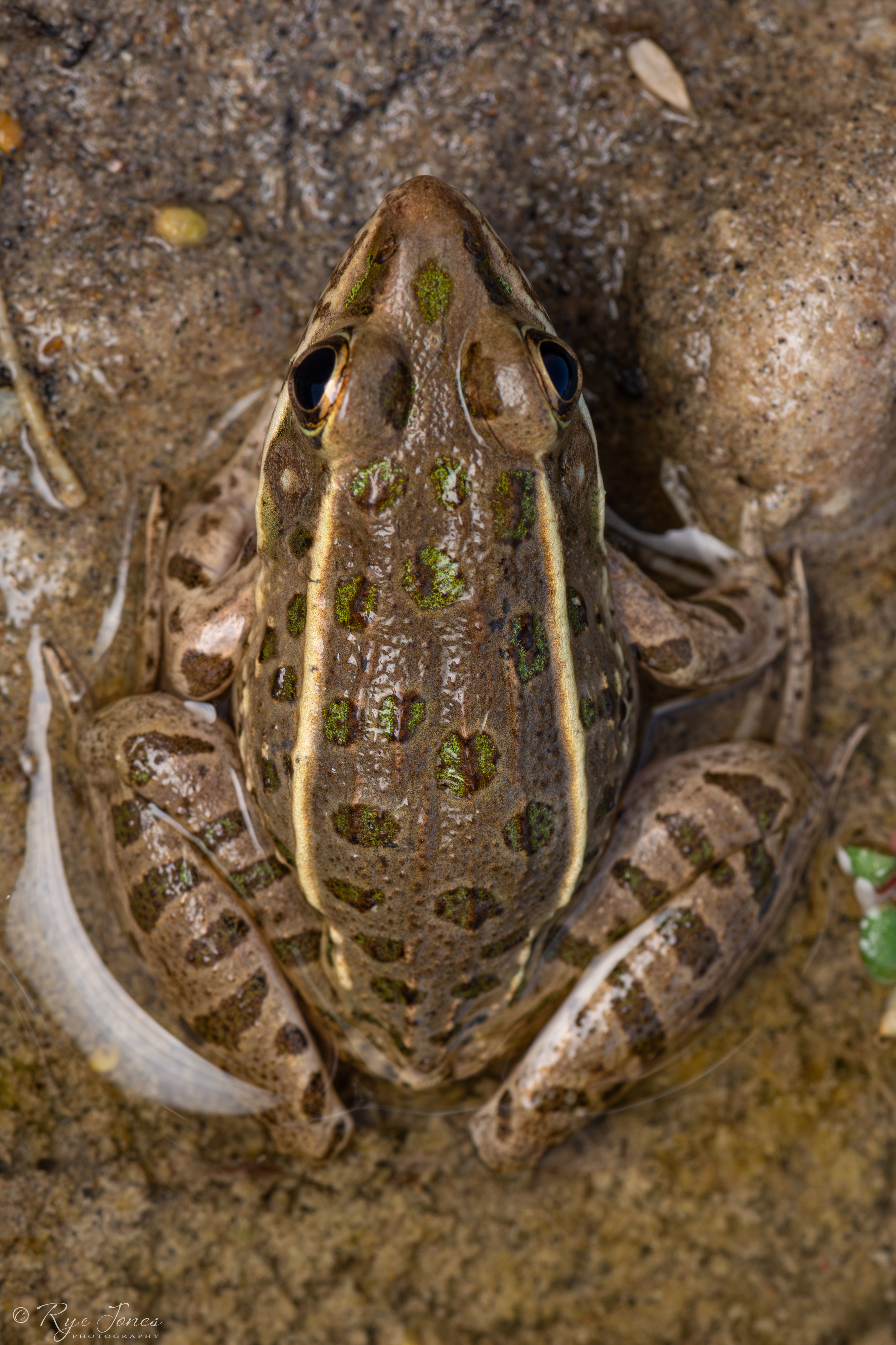 Description: Tan, brown, or green base color. Large dark brown, green, or black spots on the dorsal and sides. The spots get smaller as they get lower on the sides. The rear legs have a barred pattern with a dark reticulated pattern on the rear of the thighs. This species typically has a spot on the snout and a light-colored spot in the center of the tympanum (ear). The dorsolateral ridges are broken and inset posteriorly. A well-defined light stripe runs along the upper lip. The underside is cream or off-white colored.