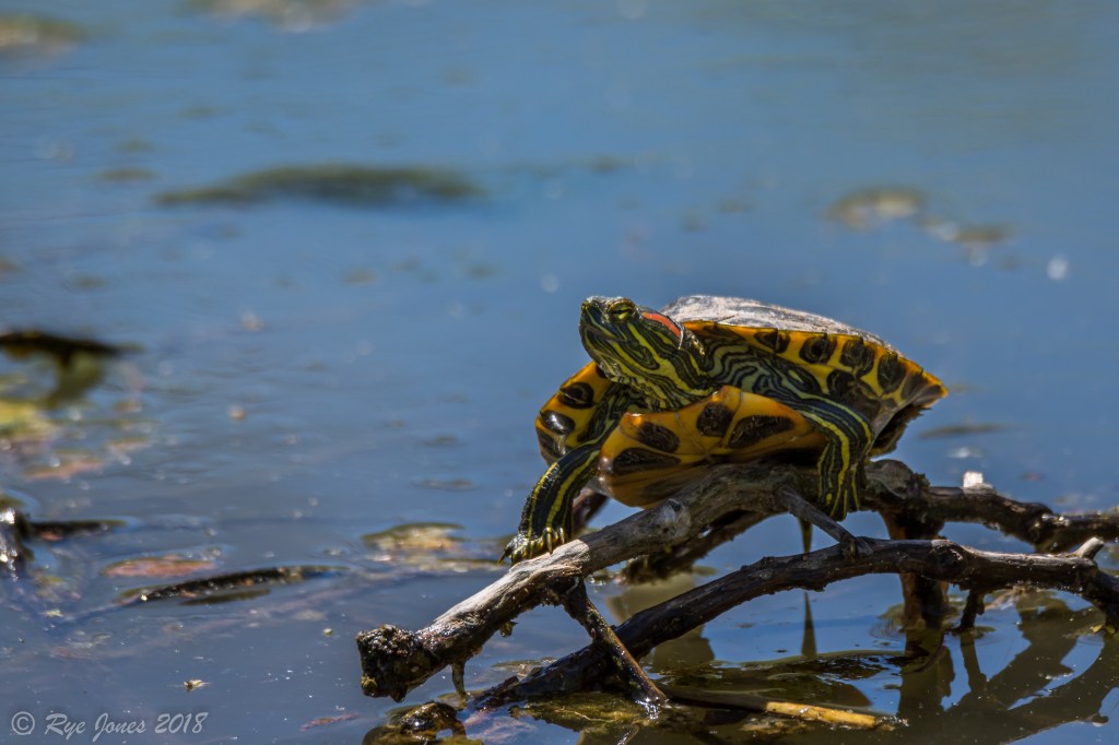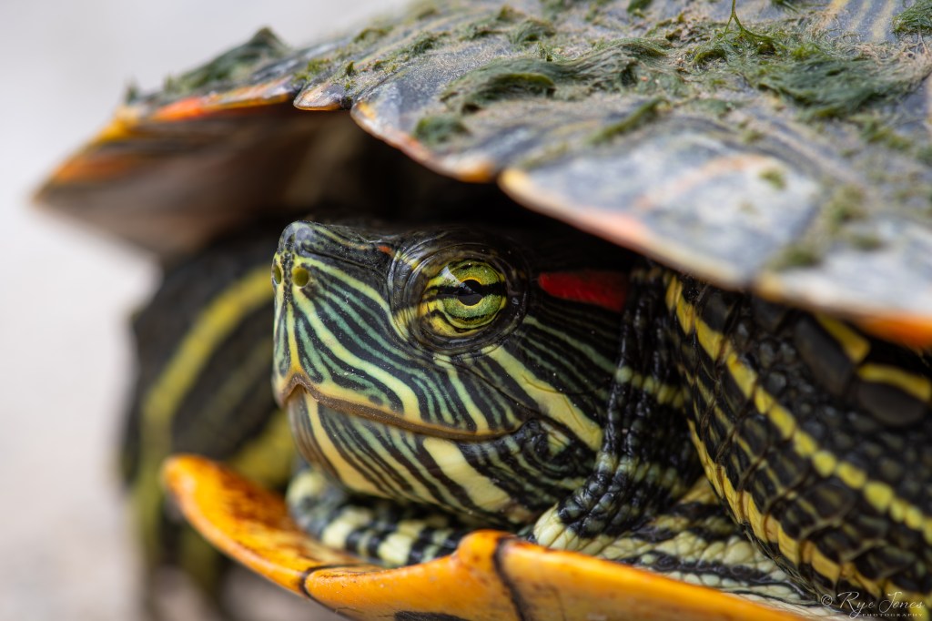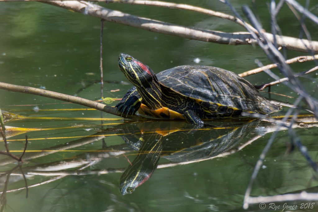 Similar Species: The Western Painted Turtle lacks a red patch on the sides of its head. It has a red plastron with a large dark central pattern. Its carapace has a smooth rear edge.