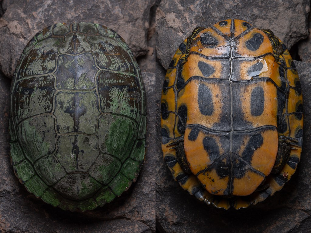 Description: The carapace is brown, olive, or black with a serrated rear edge. The plastron is yellow or tan with large dark blotches. The head, limbs, and tail are black, brown, olive, or green with numerous yellow stripes. There is a red patch on each side of the head behind the eyes. Juveniles may be more heavily patterned with thin yellow and green lines on the carapace that fade with age. Adult males have large front claws, a concave plastron and get darker with age.