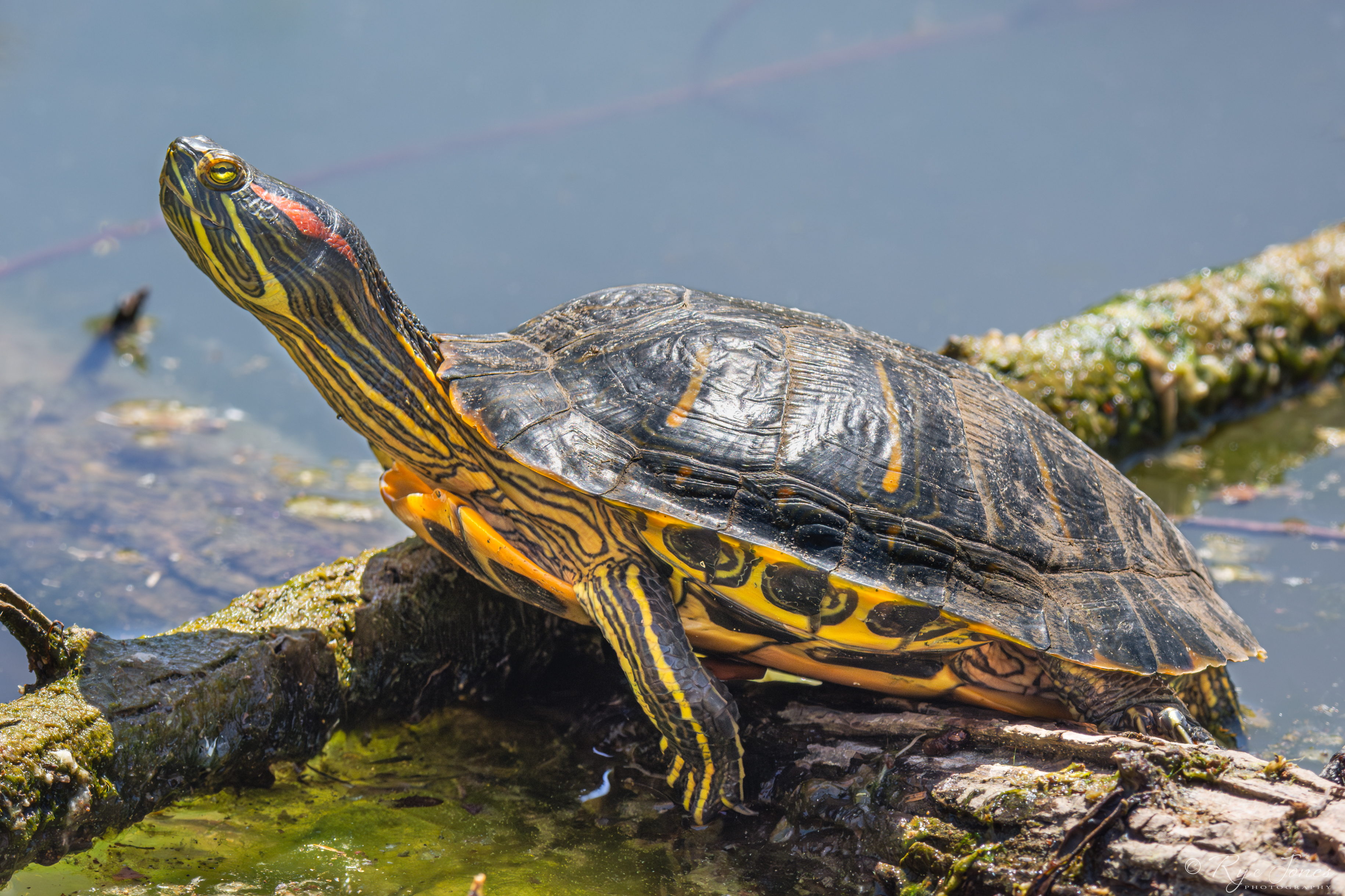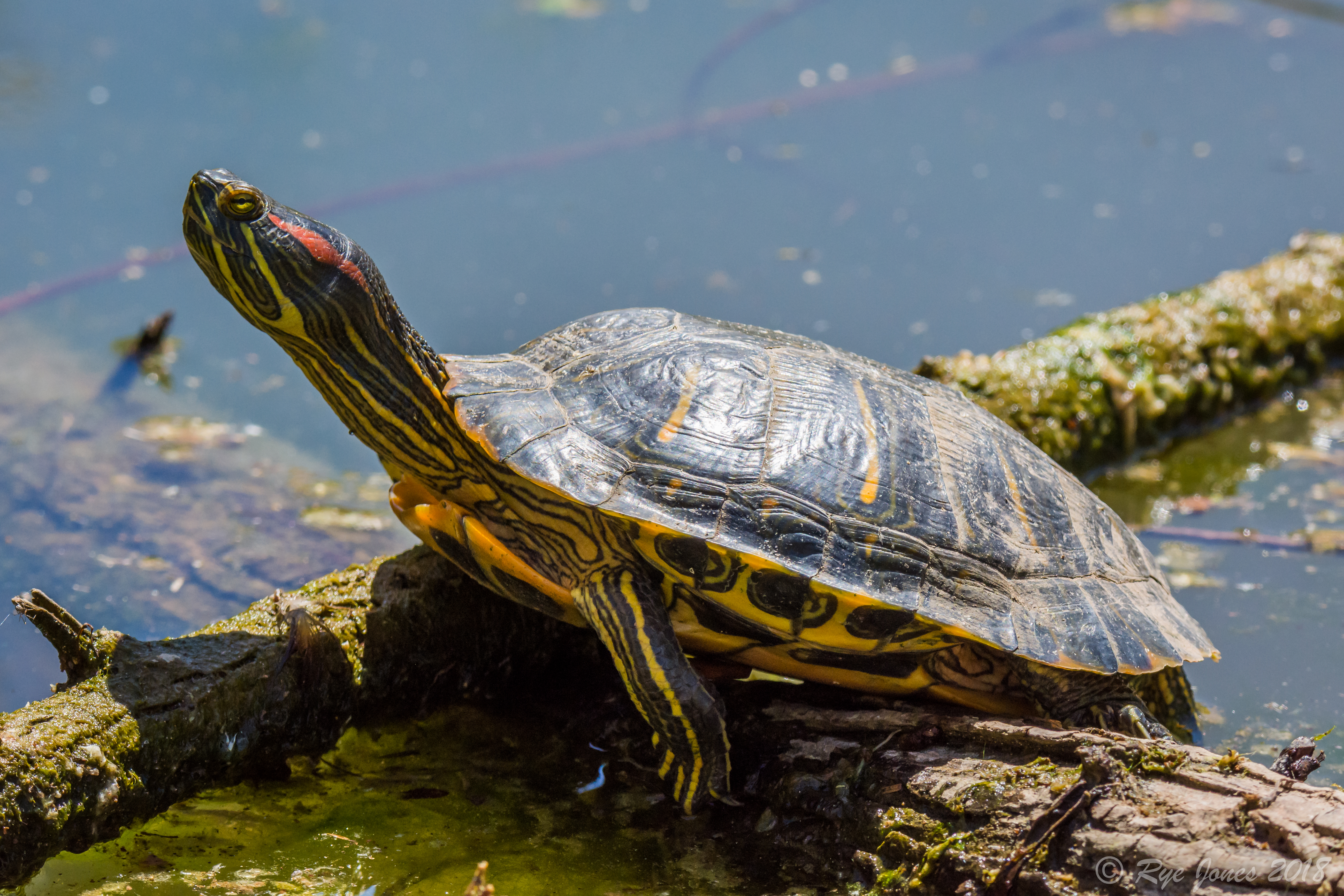 Similar Species: The Western Painted Turtle lacks a red patch on the sides of its head. It has a red plastron with a large dark central pattern. Its carapace has a smooth rear edge.