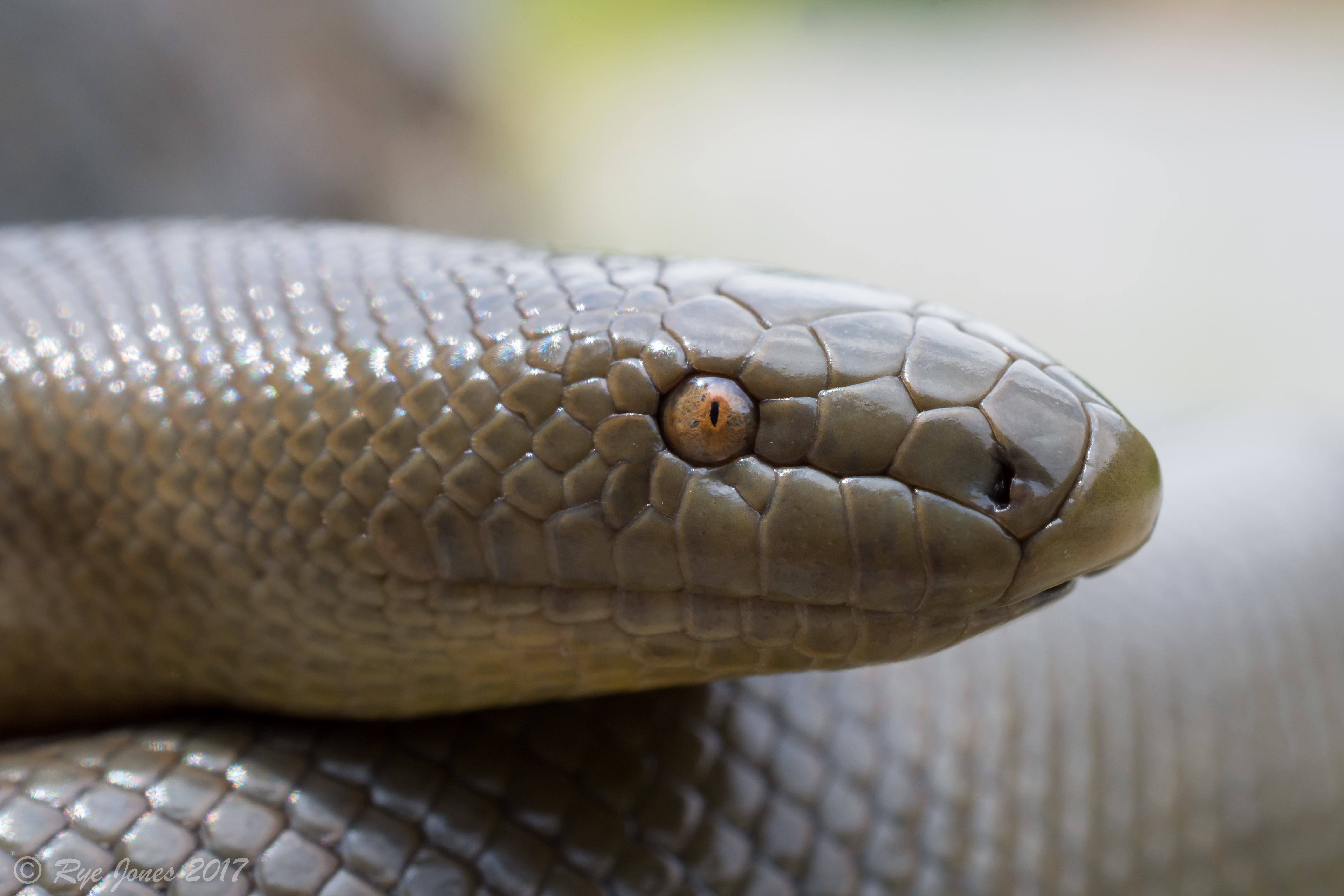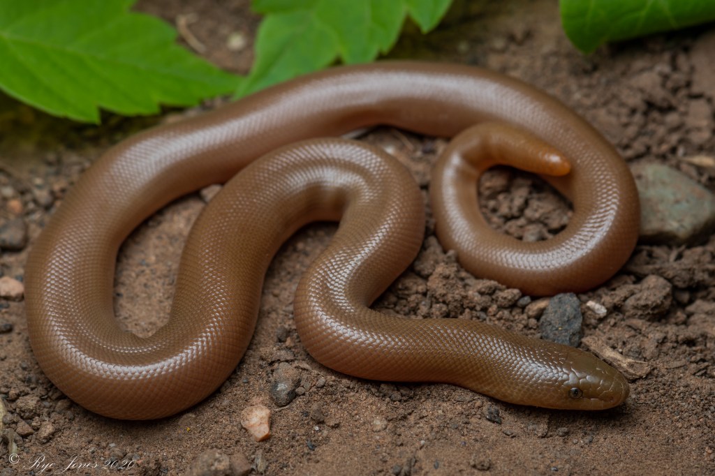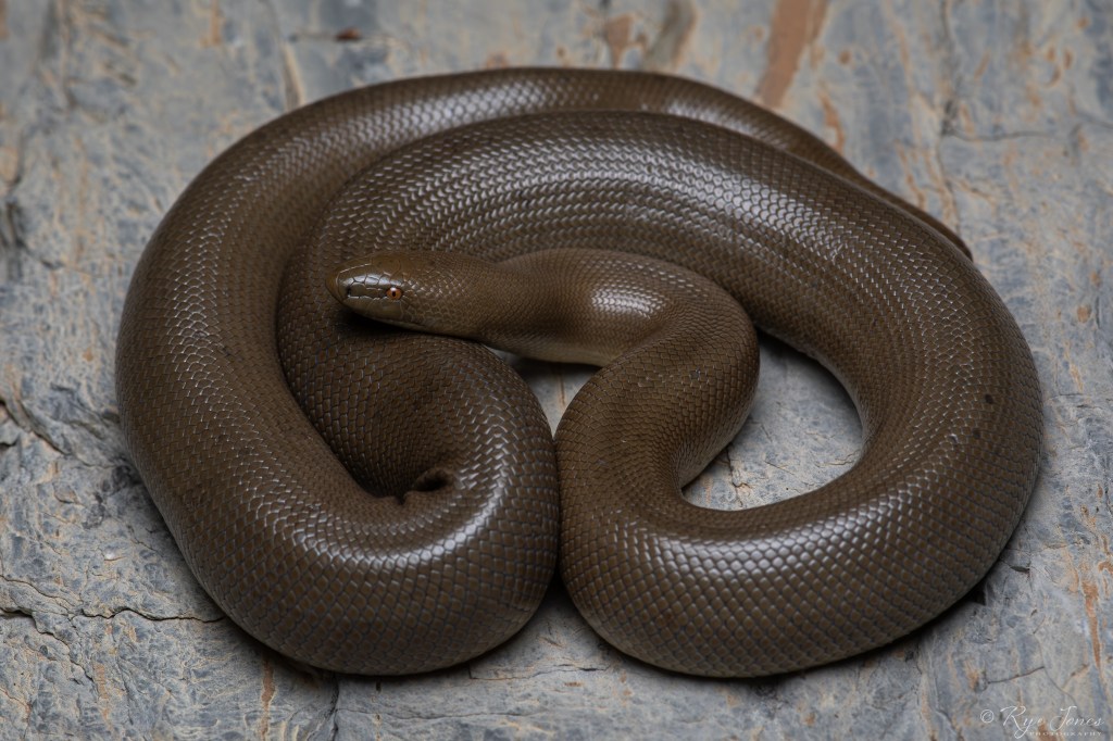 Description: A unicolored tan, brown, or olive green snake with smooth scales. Juveniles can be lighter shades of tan and sometimes pink in color. The ventral is patternless and cream to yellow in color. They have small eyes compared to their head size and a blunt tail. They get their common name from the loose folds of skin that make them appear to be made of rubber.