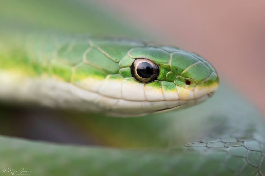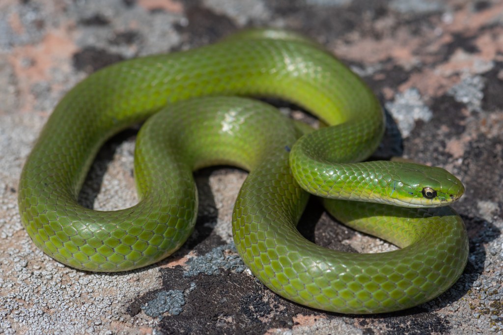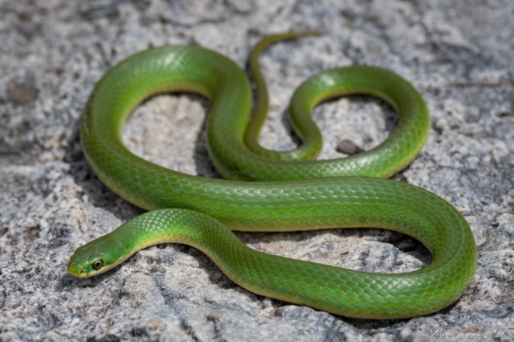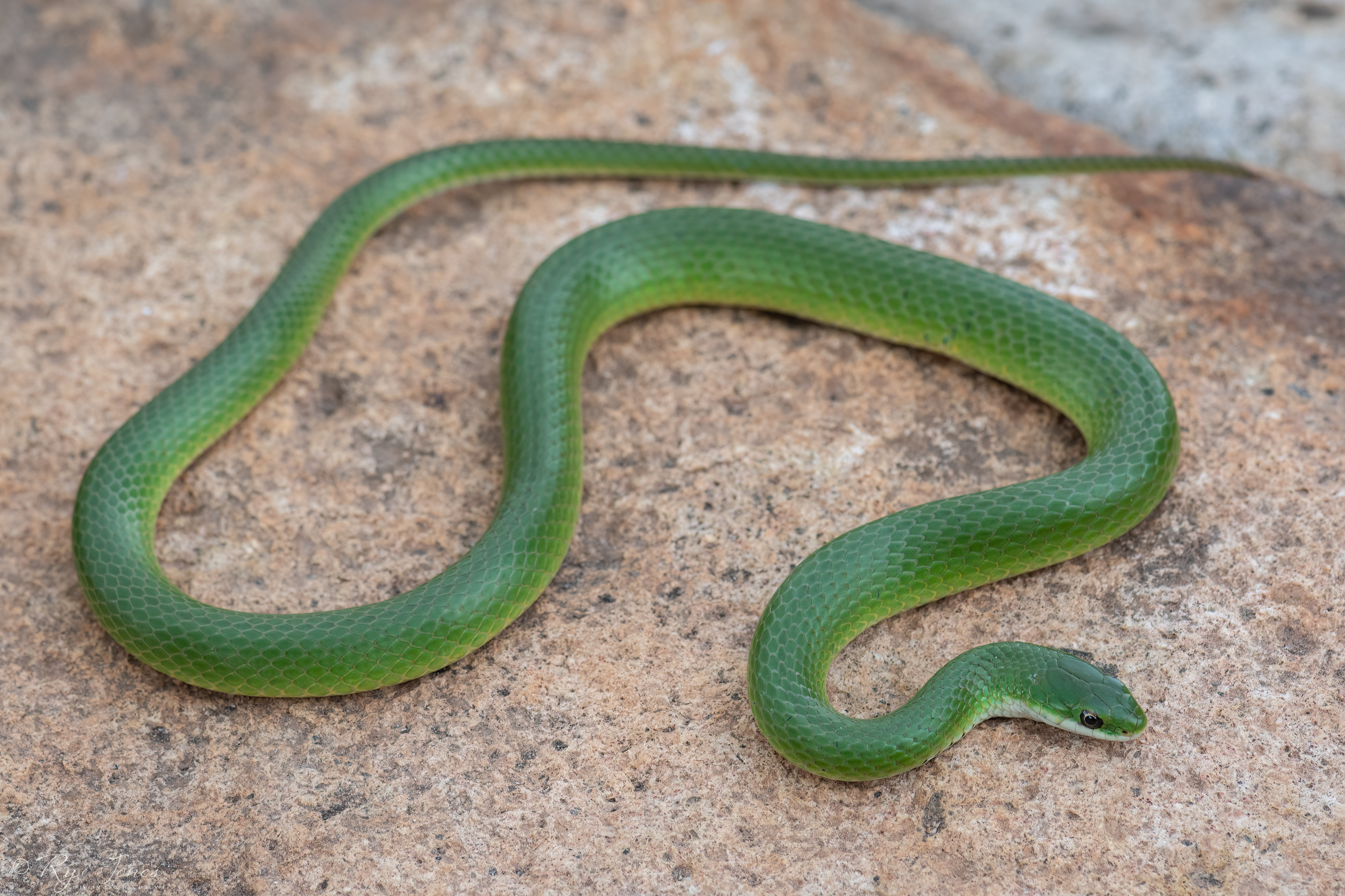 Description: A patternless, vibrant green snake with smooth scales. The ventral is also patternless and is white, cream, or yellow in color.