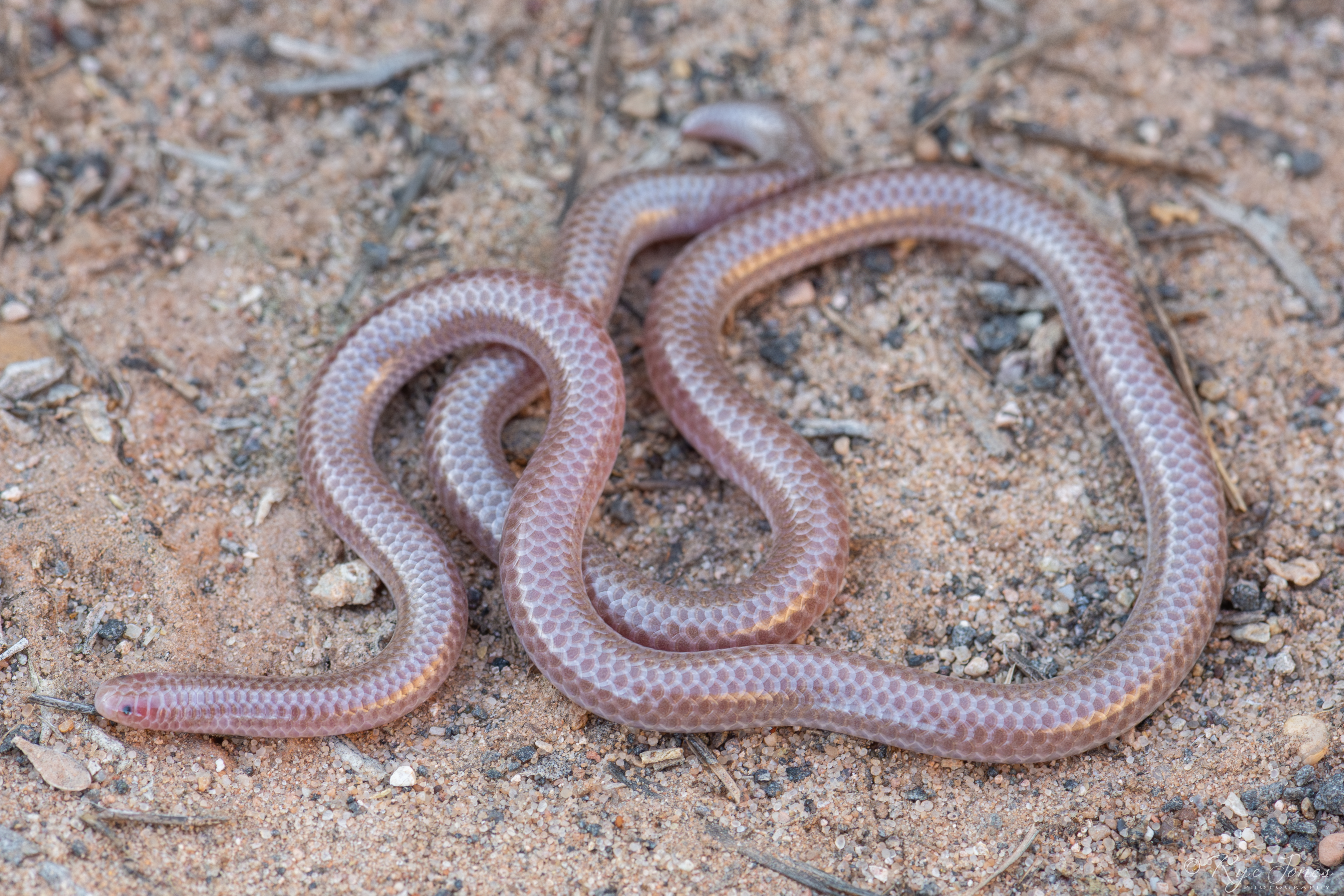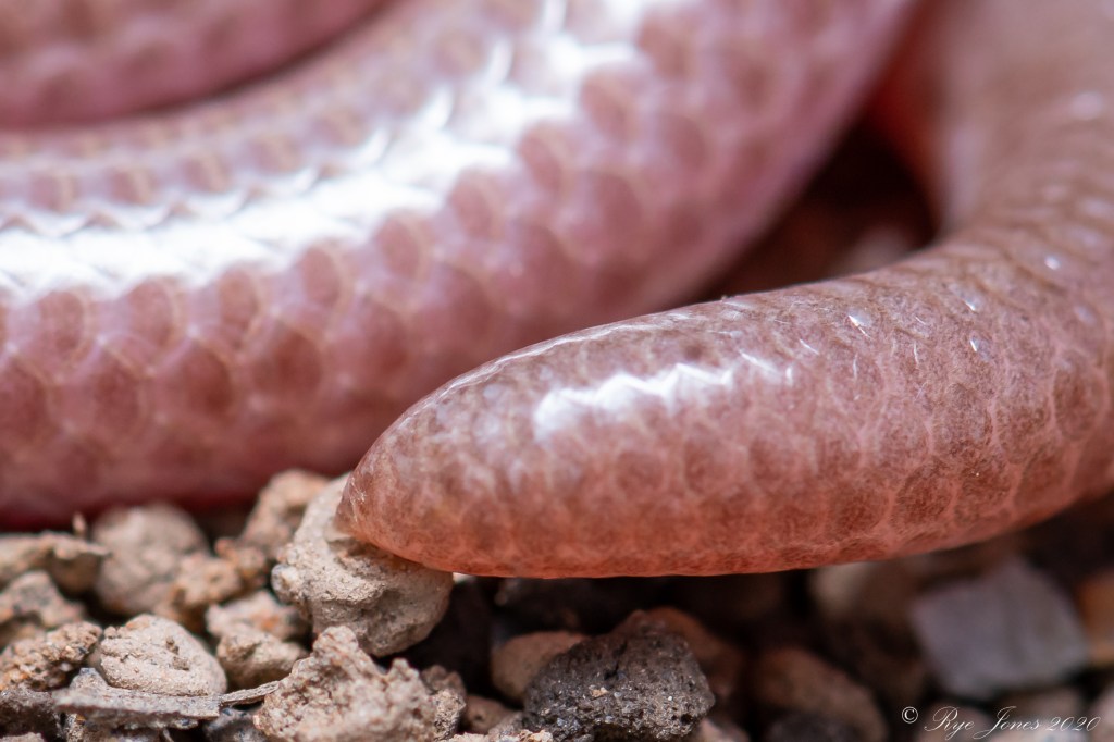 Description: This snake has smooth, shiny scales and is cylindrical in shape. It is pink or tan in color and often has a silvery sheen. The vestigial eyes appear as black dots. It has a spine on the tip of its tail. This snake is rarely seen due to its fossorial nature.