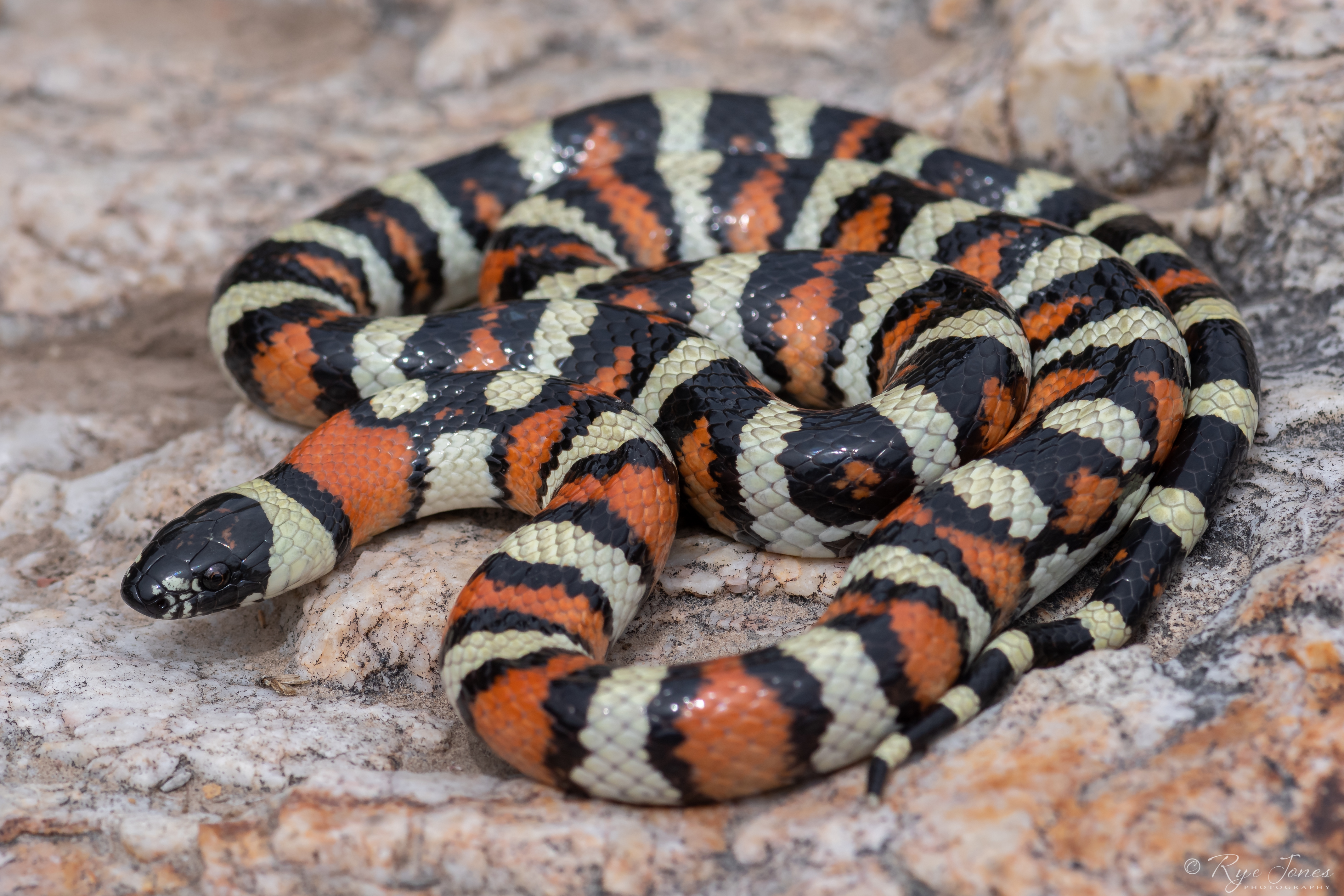 Description: A banded snake with alternating red, black, and white bands. Sometimes the red is replaced by orange and the white is replaced by yellow or cream. The bands and color extend around the ventral of the snake. This snake has smooth scales. It is primarily fossorial in nature and spends the majority of its life underground.