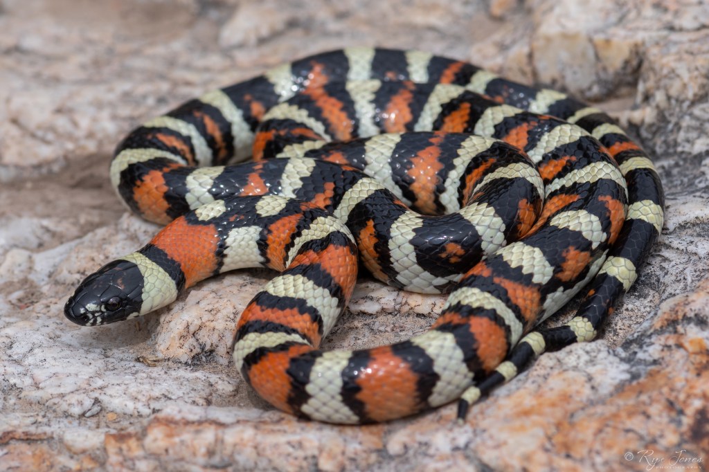 Similar Species: The white snout of the Utah Mountain Kingsnake is often used as a distinguishing characteristic; however, this is not always accurate, as Utah Milksnakes can also have a white or mottled snout. There is a slight difference in overall head shape, with the milksnake having less distinction between the neck and rear of the jaw and a more rounded snout. Additionally, Utah Mountain Kingsnakes generally have more than 43 white bands, whereas Utah Milksnakes have typically fewer than 38, but again, this is not always an accurate method of identification. Habitat, range, and behavior should also be considered when trying to identify these two snakes.