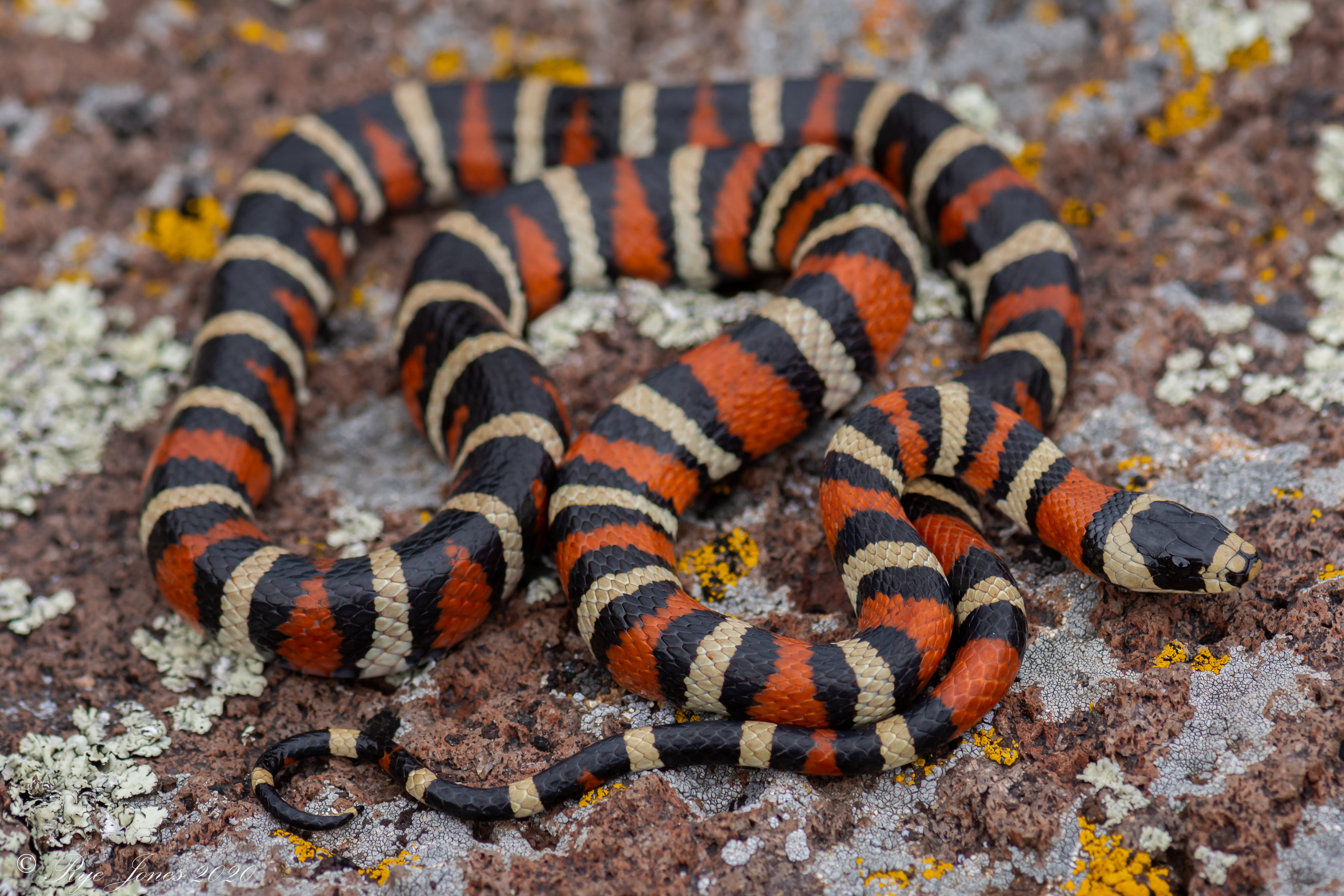 Description: A banded snake with alternating red, black, and white bands. The bands and color extend around the ventral of the snake. The black bands often connect on the dorsal creating crossovers. They have smooth scales and typically have a white snout. The head is wider than the neck. They are primarily terrestrial in nature.