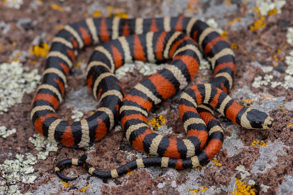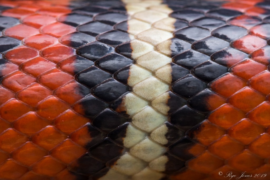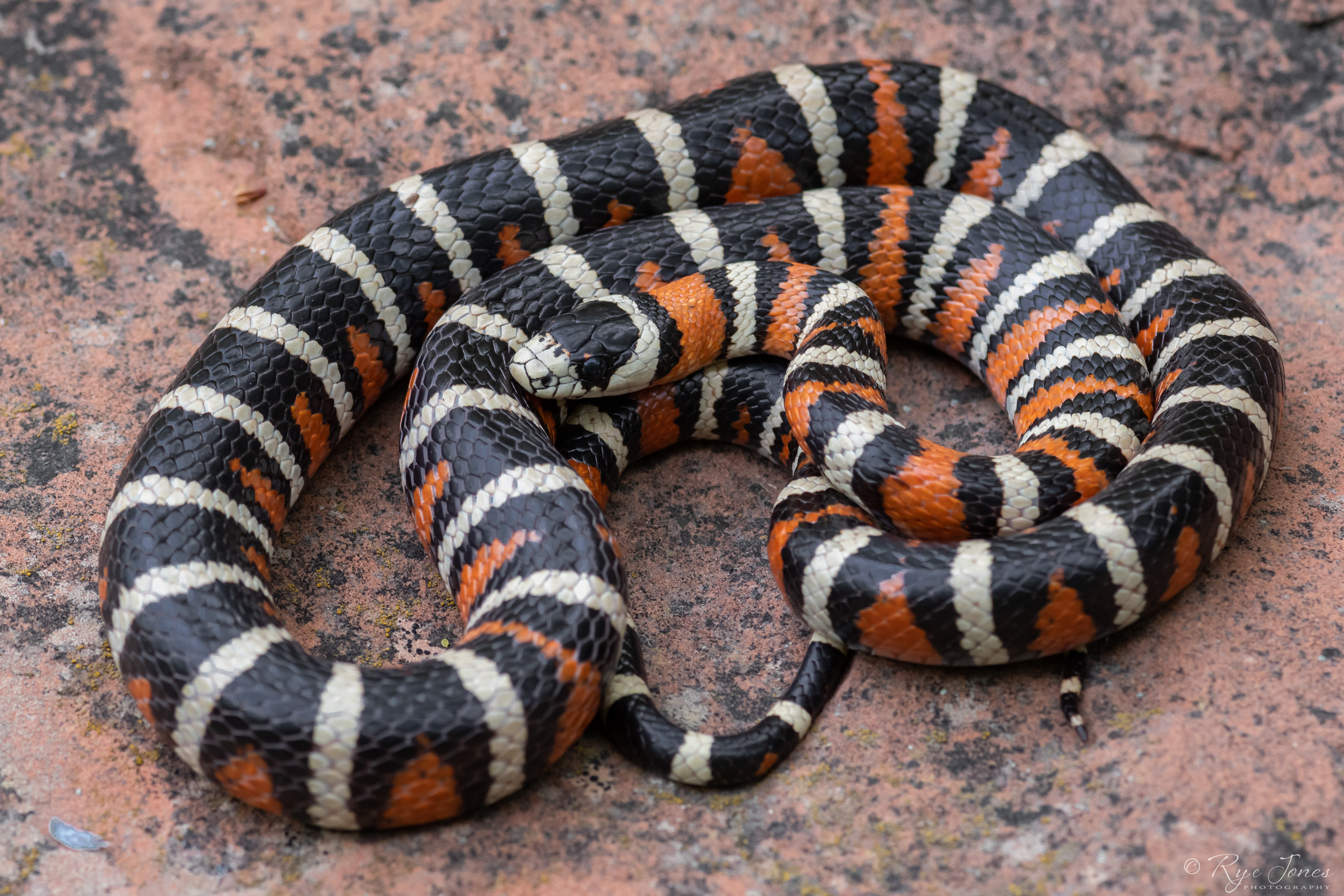 Description: A banded snake with alternating red, black, and white bands. The bands and color extend around the ventral of the snake. The black bands often connect on the dorsal, creating crossovers. They have smooth scales and typically have a white snout. The head is wider than the neck. They are primarily terrestrial in nature.