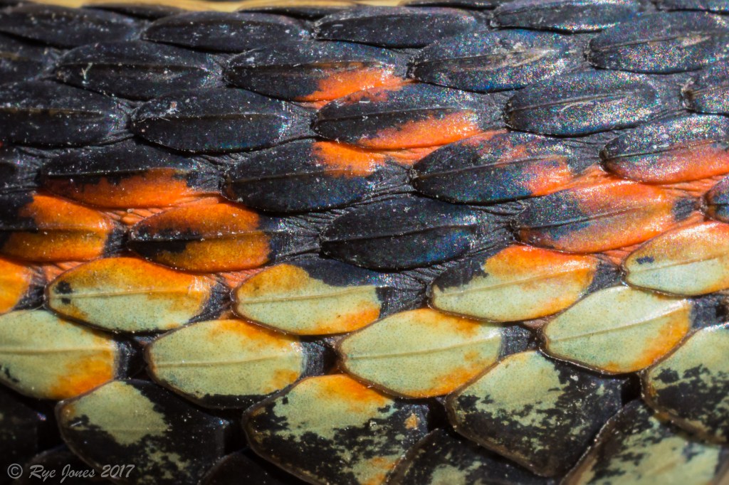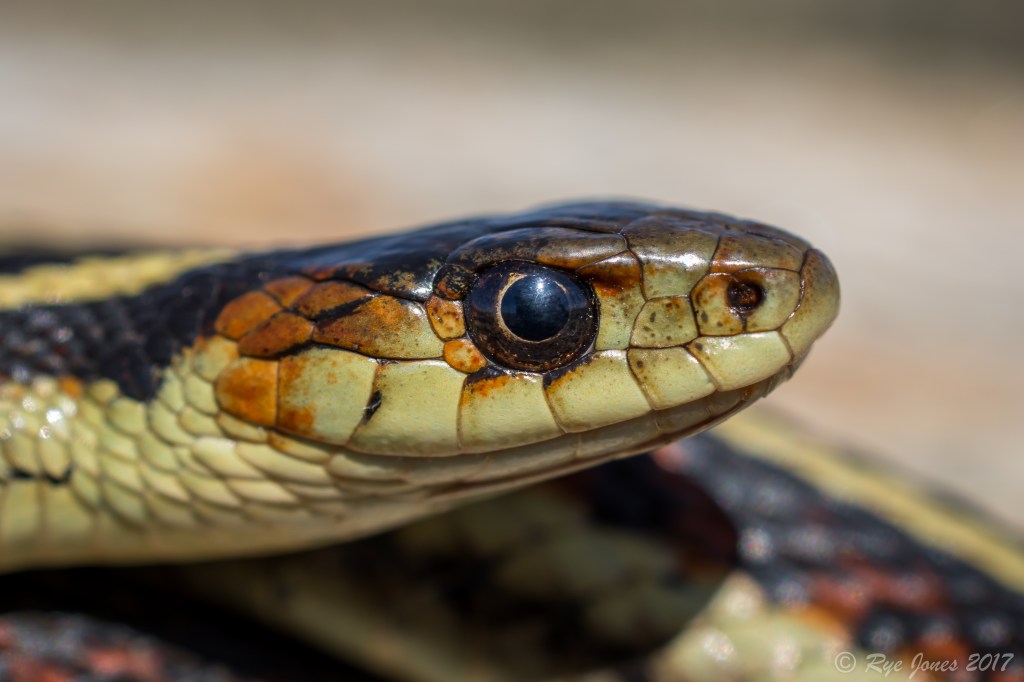 Description: The base color is dark brown or black with a well-defined yellow middorsal stripe and yellow lateral stripes along each side. Varying degrees of red come up from the lateral stripes along the body. This snake has keeled scales and 7 upper labial (lip) scales.
