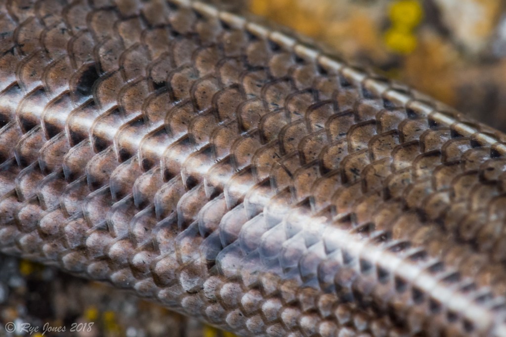 Description: The base color consists of shades of brown, tan, and olive. Thin alternating light and dark stripes run the length of the body. The stripes generally fade to a unicolored tail. The tail can be twice the length of the body, but is often broken and/or regenerated. The body is elongated with small limbs. The scales are smooth and shiny with rounded rear edges. The scales can often be edged in dark brown or black coloration, giving the dorsal a busy pattern. Males develop orange coloration around their mouths and throat during the breeding season. Juveniles have a darker overall coloration with less patterning and a bright blue tail.
