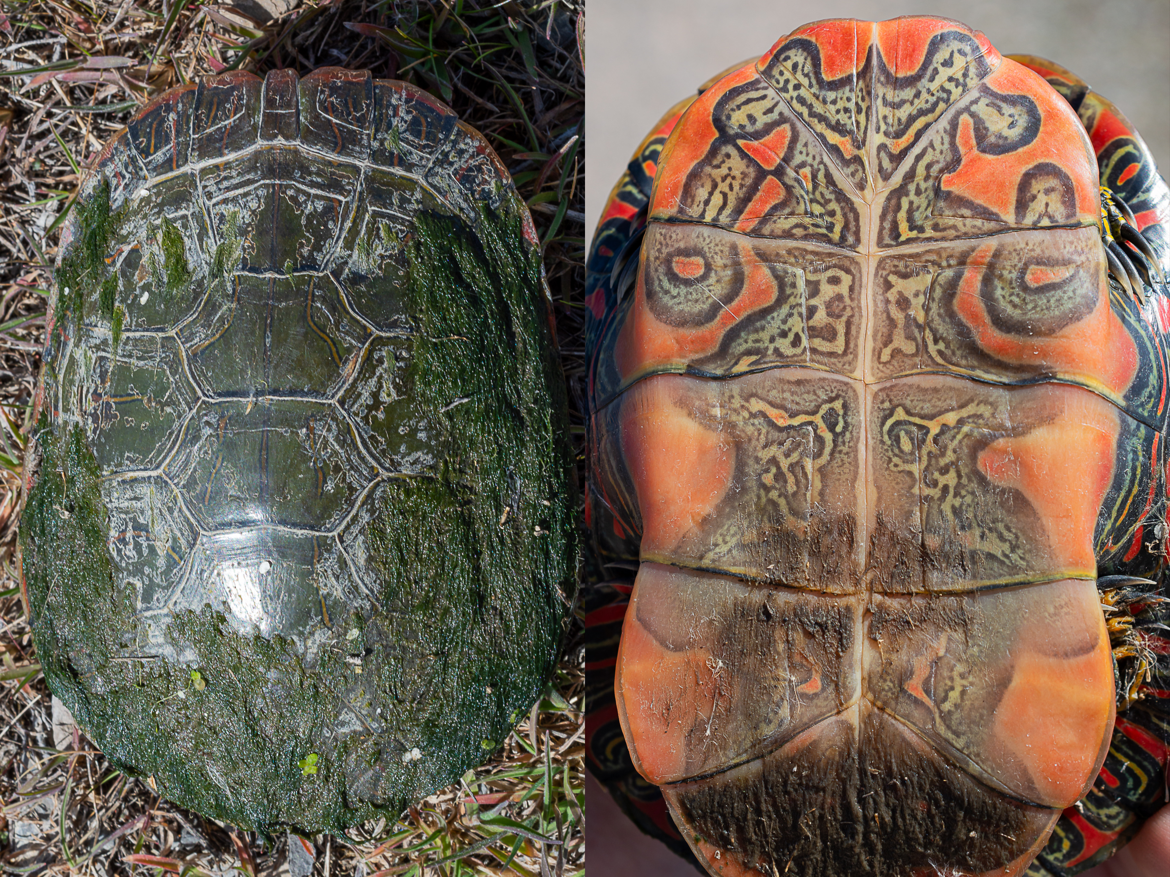 Description: The carapace is smooth and oval-shaped. It is brown, black, or olive in color with thin yellow and red lines on the outside edge. The rear edge of the carapace is smooth. The plastron is red or salmon-colored with a large dark central pattern. The head, limbs, and tail are green, olive, brown, or black in color with numerous yellow stripes. Adult males have large front claws.