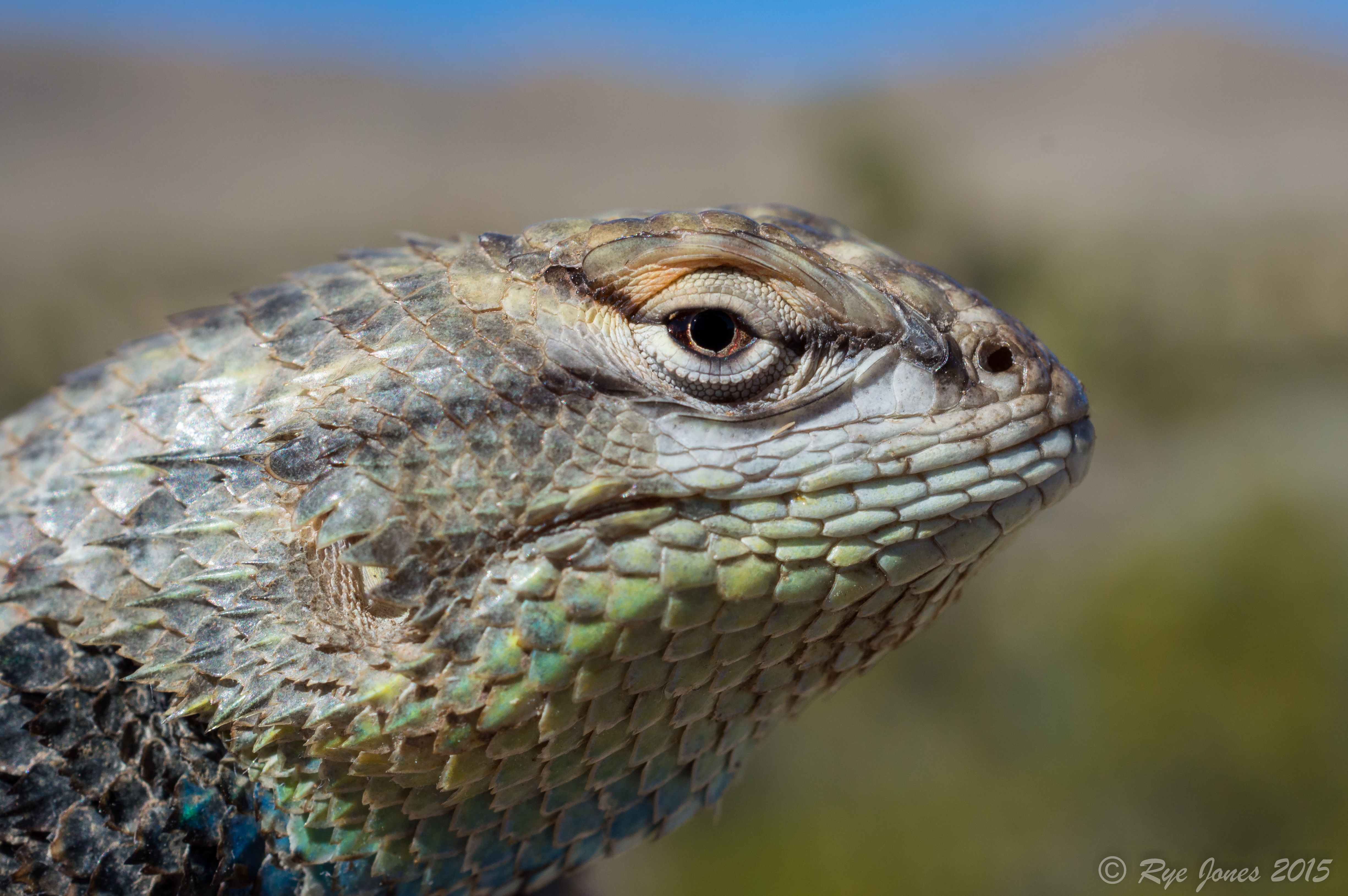 Description: Gray or brown base color. The dorsal pattern is often faint or absent. Scattered yellow scales across the dorsal and sides. A dark wedge on each side of the neck above the shoulders. The large overlapping scales are keeled and pointed, giving them a spiny appearance. Males have a blue patch on their throats that often fades to a blue-green or yellow-green on the outside edges. They have blue patches edged in black on each side of their abdomen. Females have faint or absent blue coloration on their throats and abdomens and can develop orange coloration on their heads during the breeding season.
