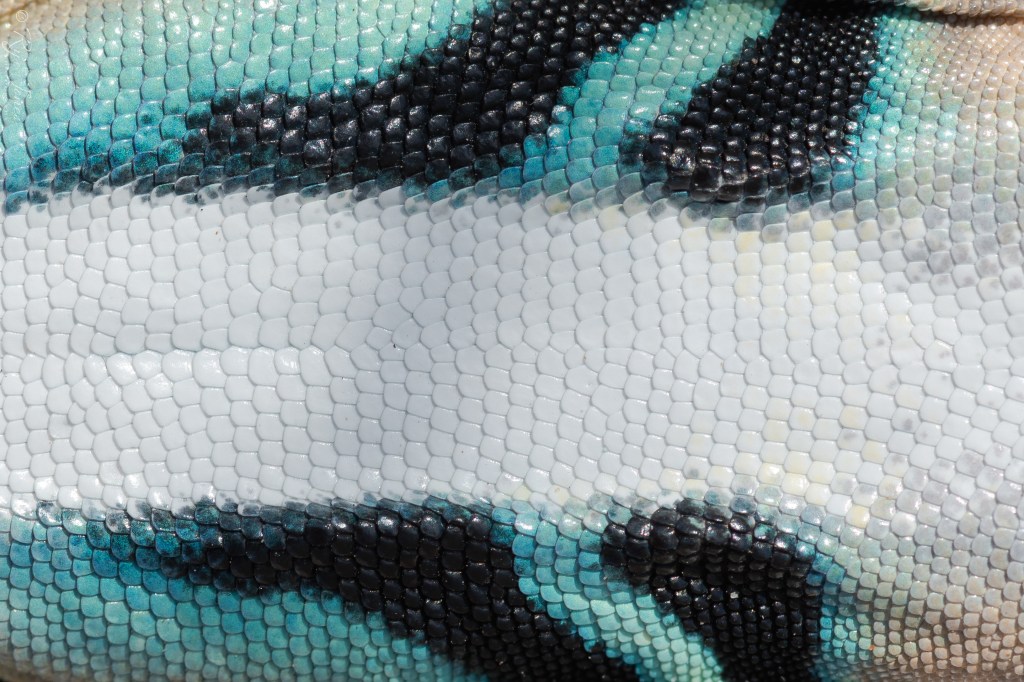 Description: Gray or tan base color with light-colored spots and two rows of light brown dorsal blotches extending the length of the body. The blotches merge at the base of the tail to form bands. The tail is flattened. The bands wrap around the tail with the underside of the tail being black and white banded, giving this lizard its common name. Dorsal blotches can be faded or absent in some adults. This lizard has long thin legs with gray crossbars on the rear legs. The sides of the body have a yellow coloration with two dark bars extending from the anterior sides to the midline. In males, the side bars extend to the ventral where they are surrounded by light blue patches. The bars are faded or absent in juveniles and females. The scales are small and granular and the head is wedge shaped.